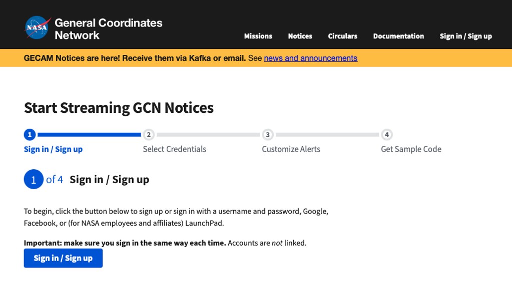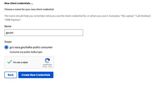 When you first come to use gocart, you will need to add a GCN Kafka Client ID and Secret to the gocart.yaml settings file. To get these credentials you will need to signup for a GCN Notices account here.