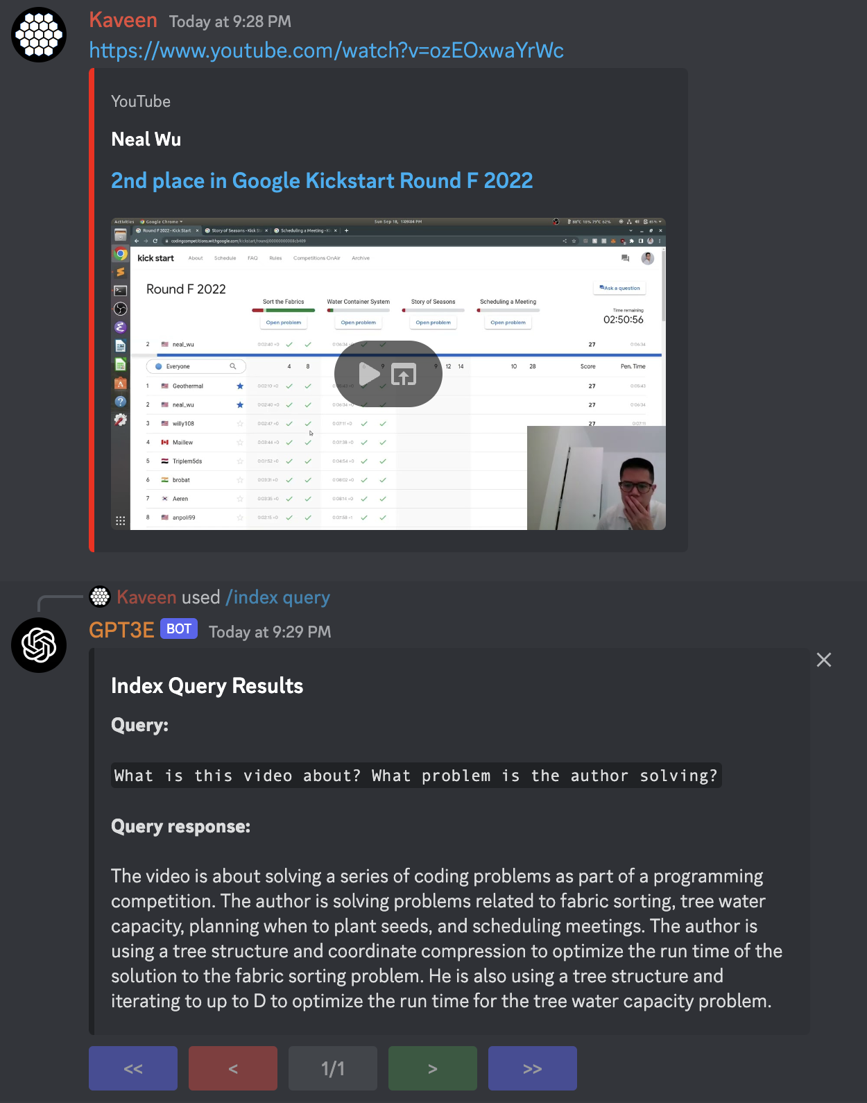 - CUSTOM INDEXES - You can now upload files to your discord server and use them as a source of knowledge when asking GPT questions. You can also use webpage links as context, images, full documents, csvs, powerpoints, audio files, and even youtube videos! Read more in the 'Custom Indexes' section below. Here's an example below with a youtube video: