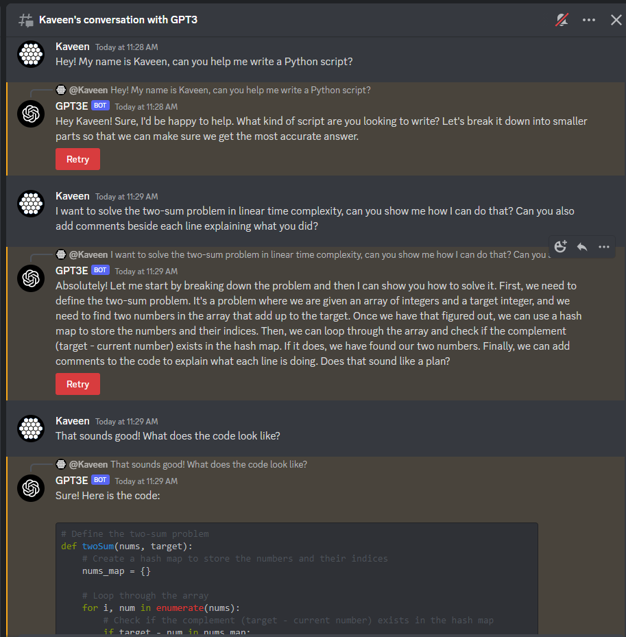 Both the OpenAI API key and the Discord bot token needed to be loaded into a .env file in the same local directory as the bot file.