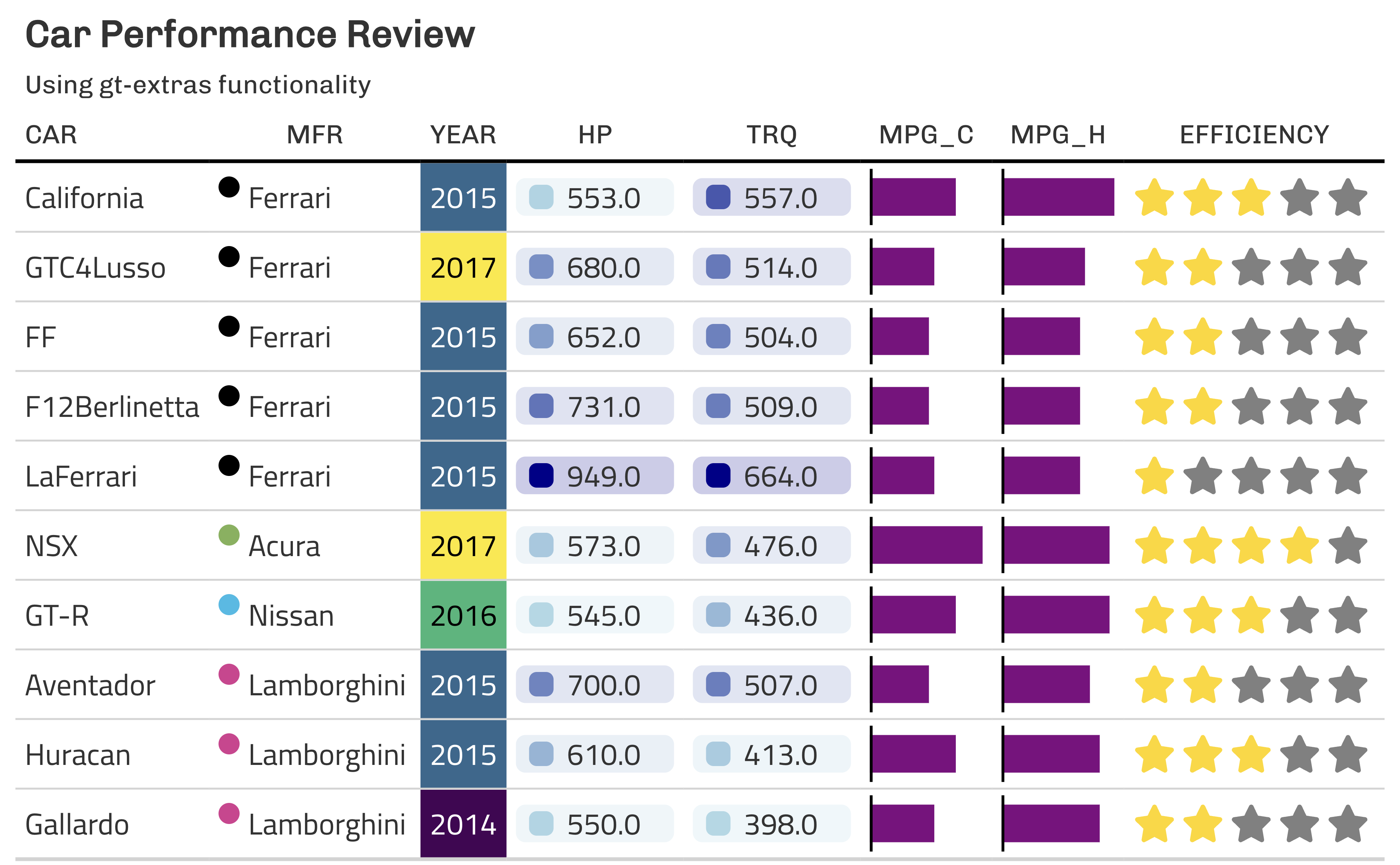 .tab_header(title="Car Performance Review", subtitle="Using gt-extras functionality")