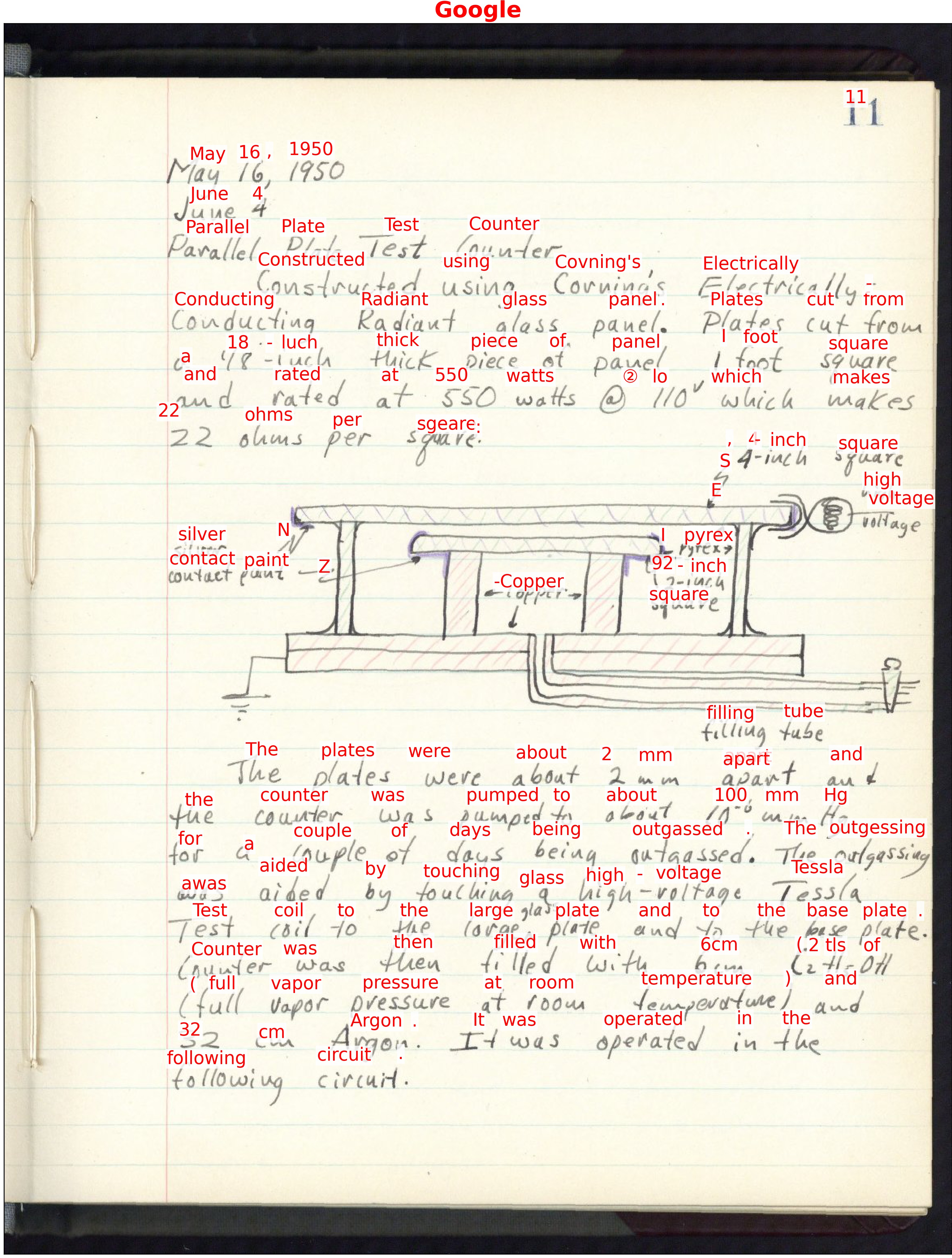 Handprint (Handwritten Page Recognition Test) is a small project to examine the performance of alternative services for offline handwritten text recognition (HTR). It was developed for use with documents from the Caltech Archives, but it is completely independent and can be applied to any images of text documents. Services supported include Google's Google Cloud Vision API, Microsoft's Azure Computer Vision API, Amazon's Textract and Rekognition, and more. Among other features, Handprint can generate versions of the input images with recognized text overlaid over them, to visualize the results. The image at right shows an example.