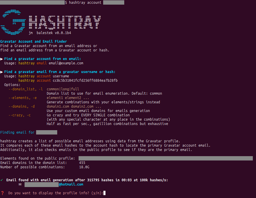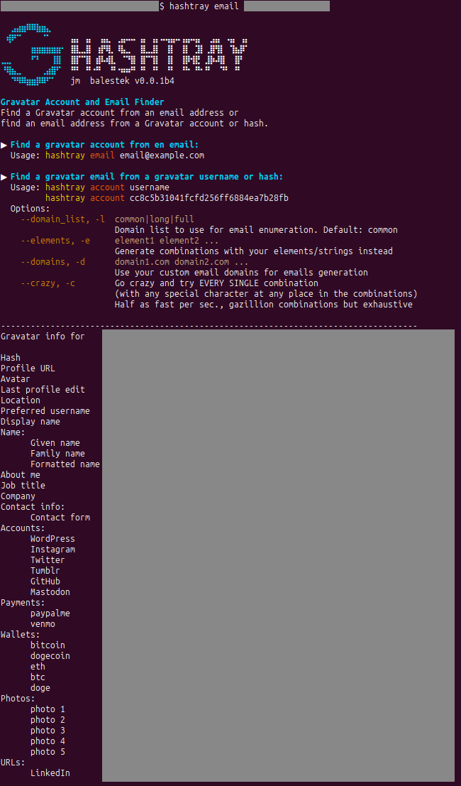 hashtray is an OSINT (Open Source Intelligence) tool designed to find a Gravatar account associated with an email address and to locate an email address using a Gravatar account username or hash. A Gravatar account can provide substantial information for pivoting purposes.