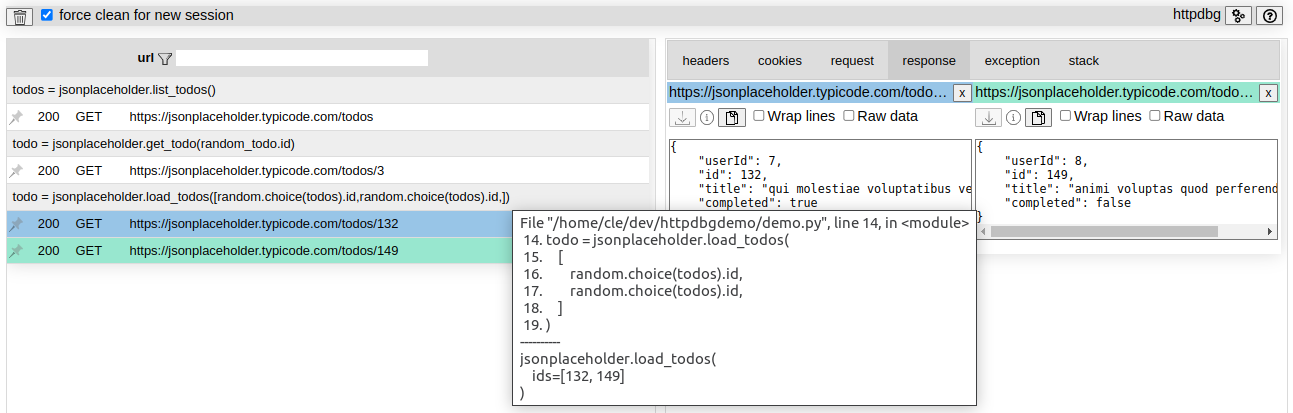To use it, execute your program using the pyhttpdbg command instead of python and that's it. Open a browser to http://localhost:4909 to view the requests: