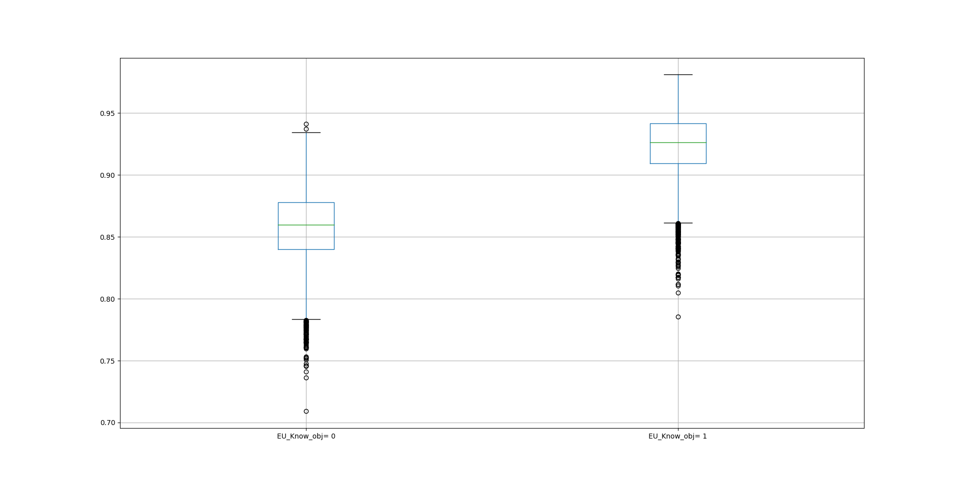 In this EU support example, the split_effects dataframe provides and illustrates via boxplots (with 95% CI) the first difference in the predicted probability of middle-category observations being informed respondents (non-inflated cases) when the split-stage covariate 'EU_know_obj' is increased by one standard deviation from its mean value (for continuous variables, the "=0" and "=1" box plots represents the mean and one standard deviation above mean value, respectively).