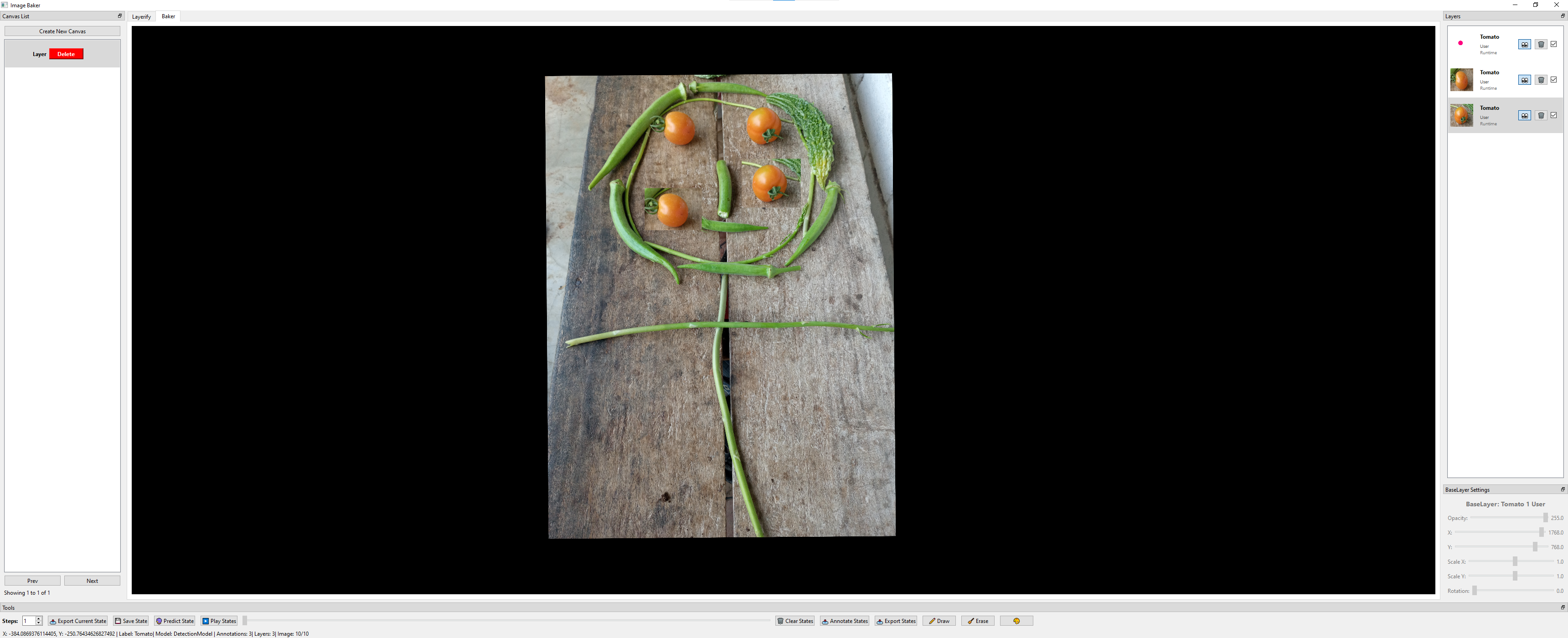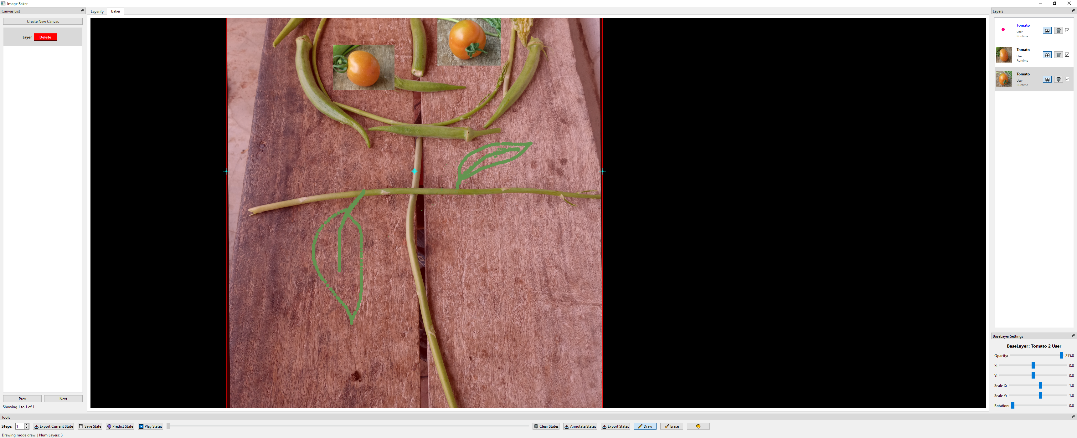 - Baking States: Arrange layers to create image variations by dragging, rotating, adjusting opacity, and more. Save the state using the Save State button or Ctrl + S.
