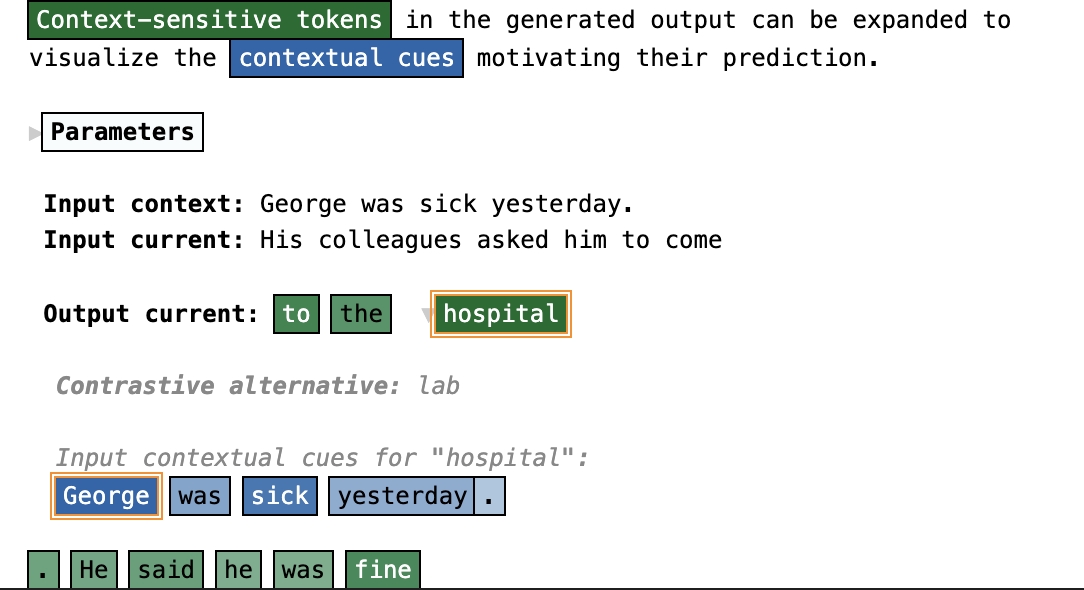 The following example uses a small LM to generate a continuation of input_current_text, and uses the additional context provided by input_context_text to estimate its influence on the the generation. In this case, the output "to the hospital. He said he was fine" is produced, and the generation of token hospital is found to be dependent on context token sick according to the contrast_prob_diff step function.