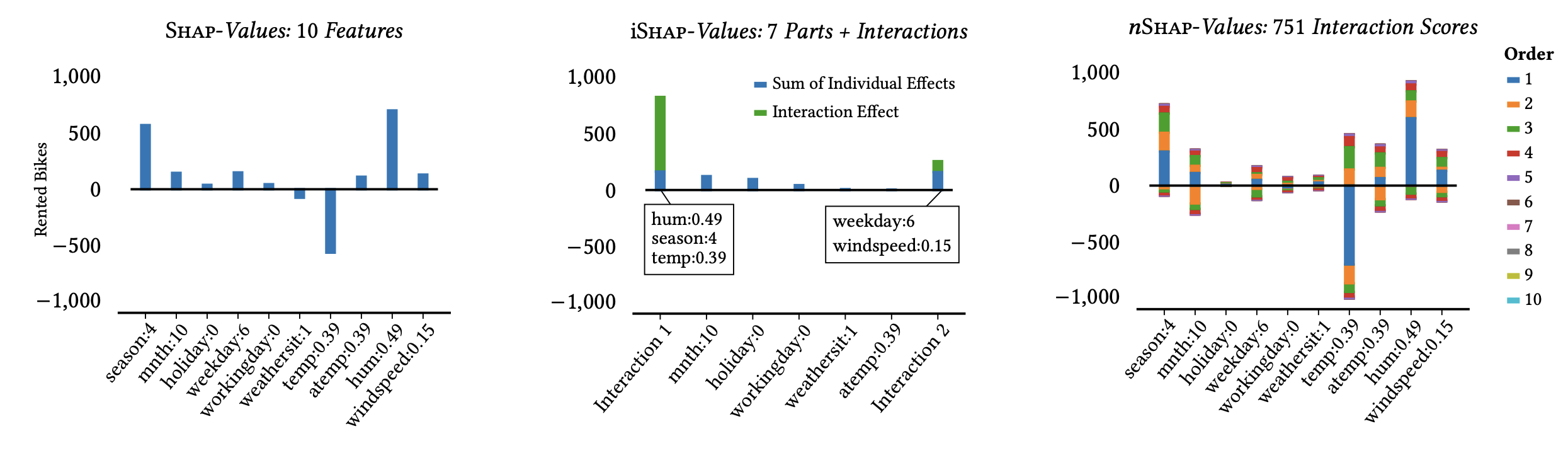 Comparison of Shap (left), our proposal iShap (middle) and 𝑛Shap (right) on the Bike Sharing dataset [4]. Shap