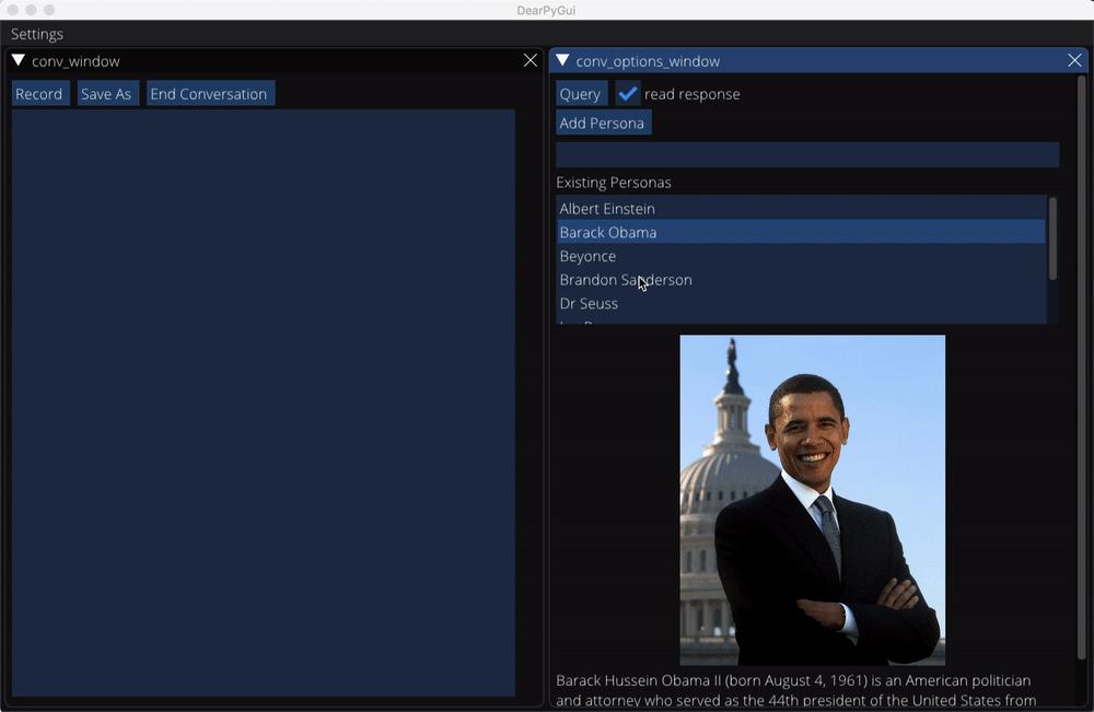 This is the core library powering a GUI that provides an audio interface to GPT3. My main goal was to provide a convenient way to interact with various experts or public figures: imagine discussing physics with Einstein or hip hop with Kanye (or hip hop with Einstein? 🤔). I often find writing and speaking to be wildly different experiences and I imagined the same would be true when interacting with GPT-3. This turned out to be partially true - the default Mac text-to-speech functionality I'm using here is certainly not as lifelike as I'd like. Perhaps more powerful audio generation methods will pop up in a future release...