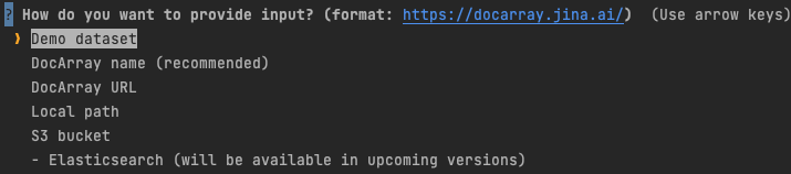 2. Choose your data source. Choose between demo datasets, a custom DocumentArray, local folder, or S3 bucket.