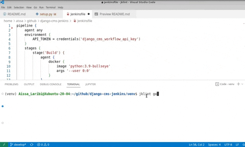 The easiest option to setup Jklint is to install the pip package and run it into a virtual environment.