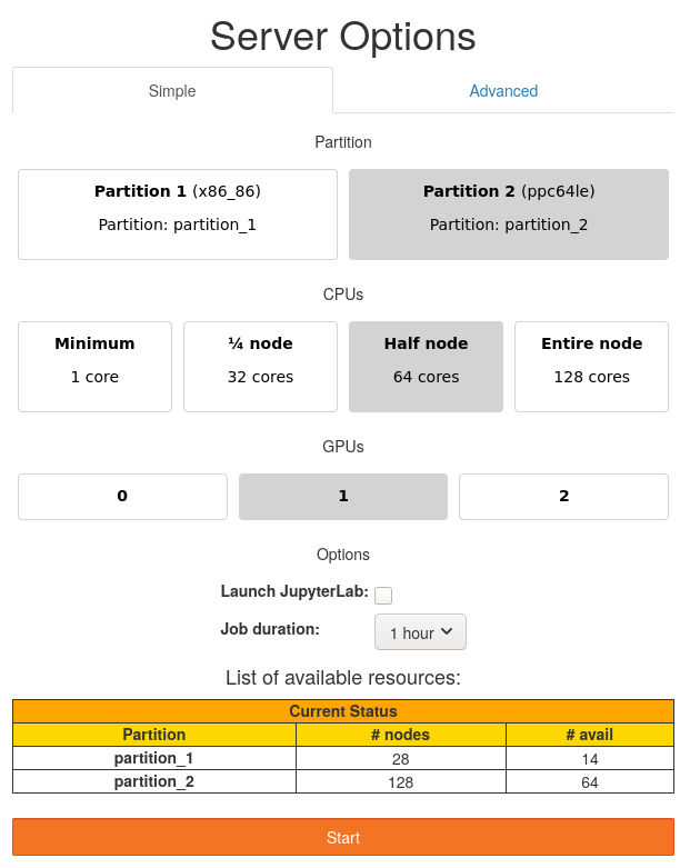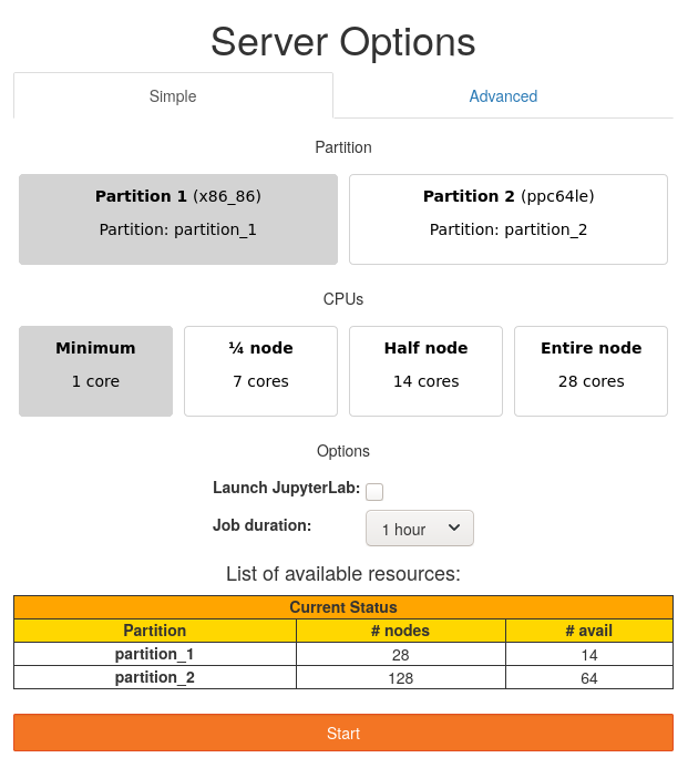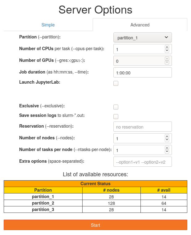 architecture: The architecture of the partition. This is only cosmetic and will be used to generate subtitles in the spawn page.description: The description of the partition. This is only cosmetic and will be used to generate subtitles in the spawn page.gpu: A template string that will be used to request GPU resources through--gres. The template should therefore include a{}that will be replaced by the number of requested GPU and follow the format expected by--gres. If no GPU is available for this partition, set toNone.max_ngpus: The maximum number of GPU that can be requested for this partition. The spawn page will use this to generate appropriate bounds for the user inputs. If no GPU is available for this partition, set to0.max_nprocs: The maximum number of processors that can be requested for this partition. The spawn page will use this to generate appropriate bounds for the user inputs.max_runtime: The maximum job runtime for this partition in seconds. It should be of minimum 1 hour as the Simple tab only display buttons for runtimes greater than 1 hour.simple: Whether the partition should be available in the Simple tab. The spawn page that will be generated is organized in a two tabs: a Simple tab with minimal settings that will be enough for most users and an Advanced tab where almost all Slurm job settings can be set. Some partitions can be hidden from the Simple tab with settingsimpletoFalse.jupyter_environments: Mapping of identifer name to information about Python environment used to run Jupyter on the Slurm nodes. This information is a mapping containing:path: The path to a Python environment bin/ used to start jupyter on the Slurm nodes. jupyterhub_moss needs that a virtual (or conda) environment is used to start Jupyter. This path can be changed according to the partitions.description: Text used for display in the selection options.