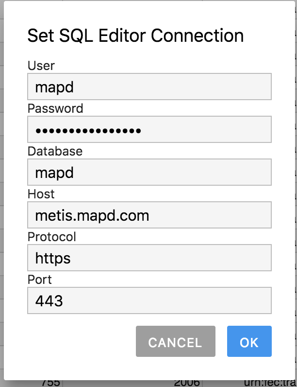 To set a default connection that will be saved and used for new editors, go to Settings > Set Default Omnisci Connection....