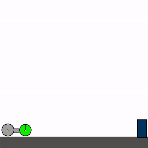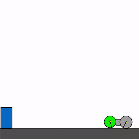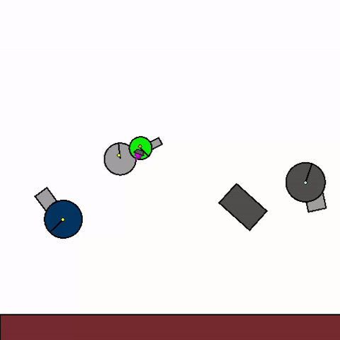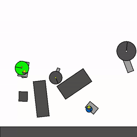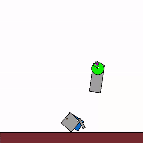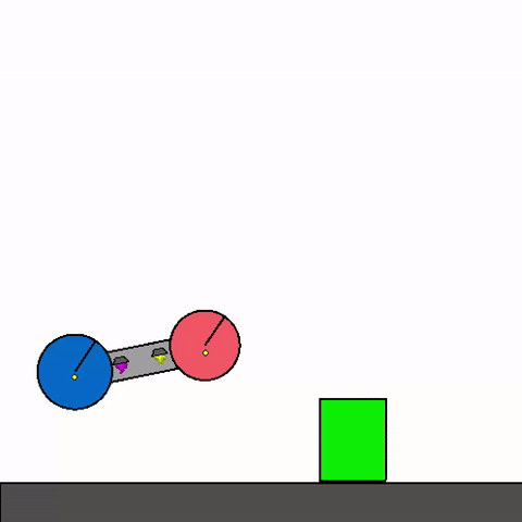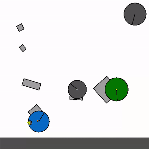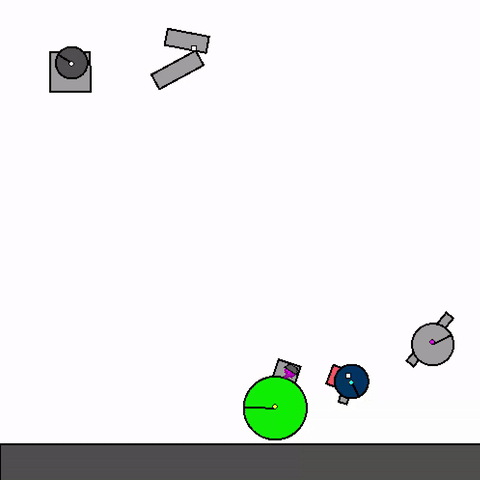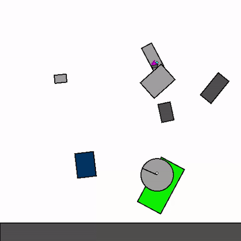 We train a general agent on millions of procedurally generated physics tasks. Every task has the same goal: make the green and blue touch, without green touching red. The agent can act through applying torque via motors and force via thrusters.