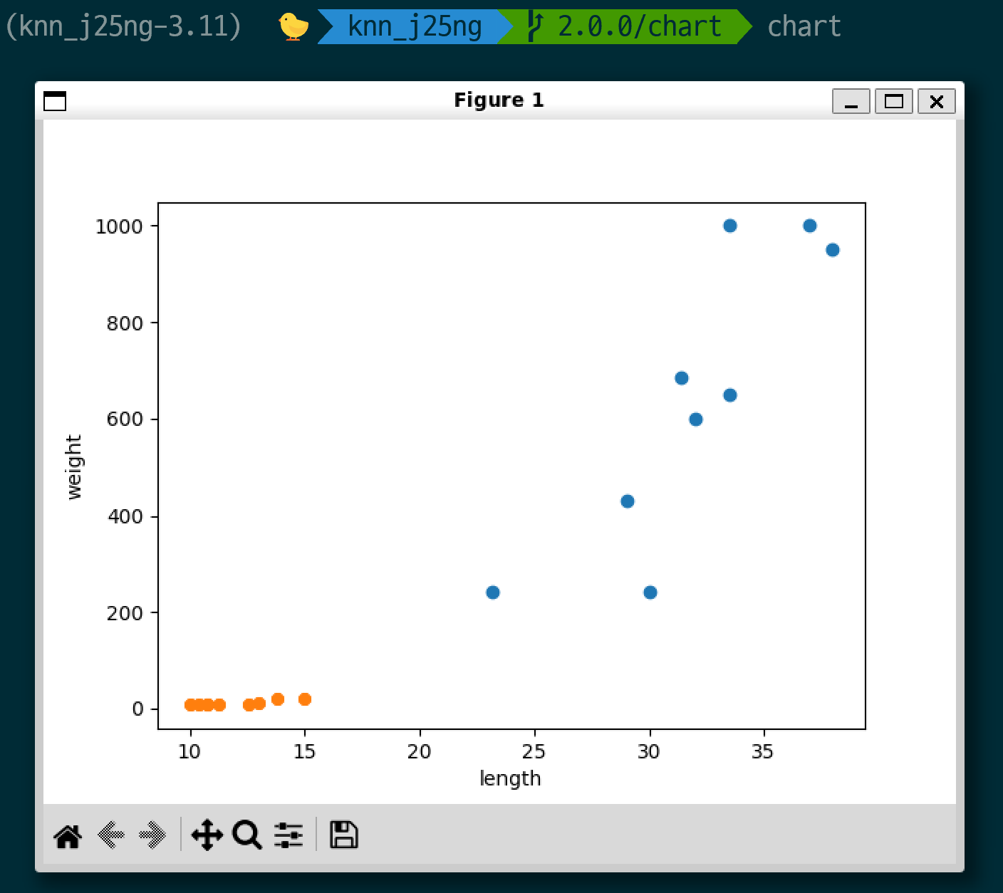 - 사용자는 길이, 무게 데이터를 입력하고 프로그램 예측 값을 출력 (이때 프로그램은 학습 데이터가 없어 임의의 값을 예측)