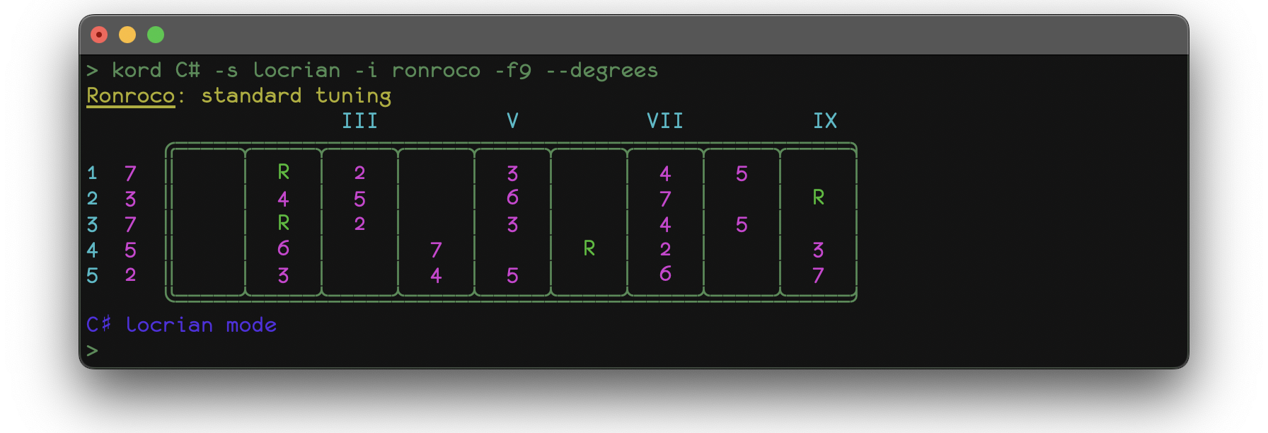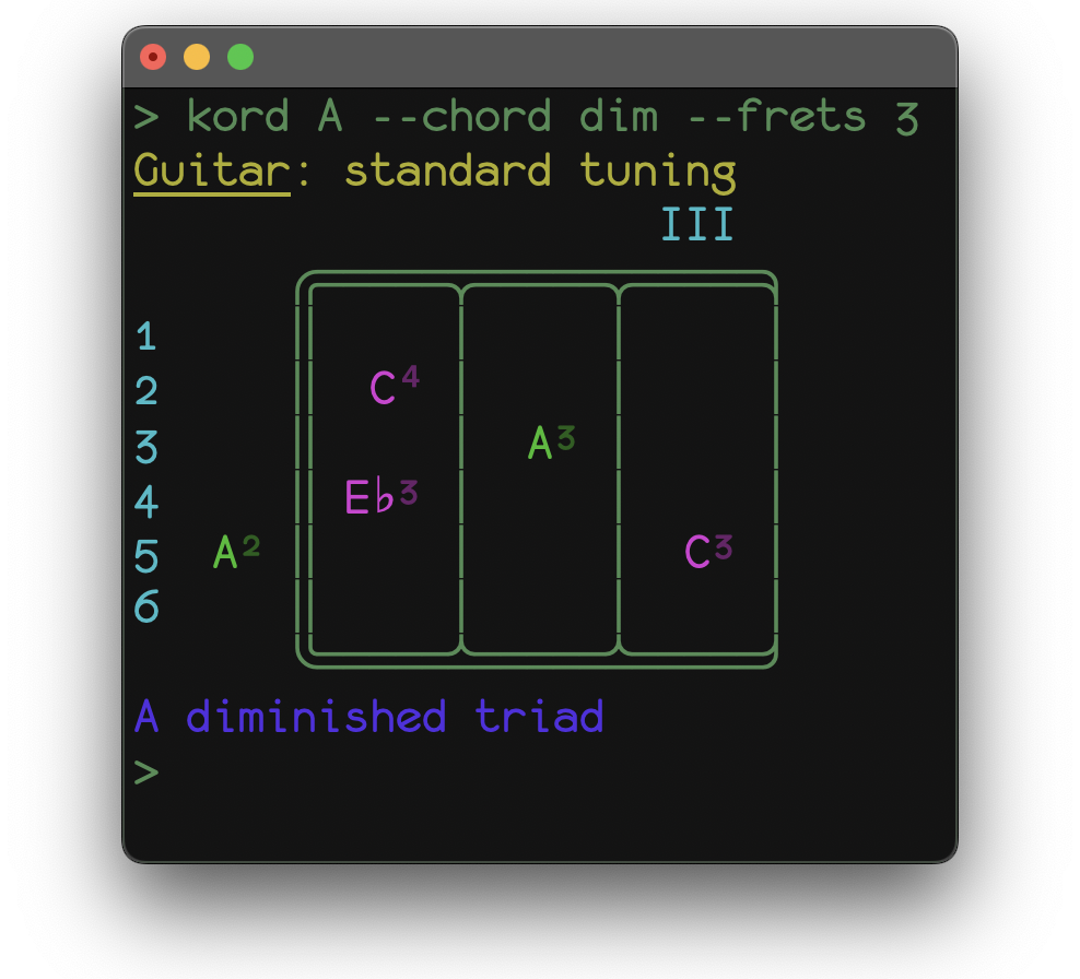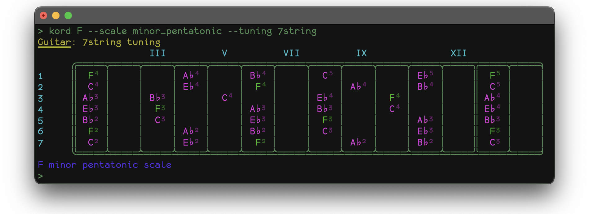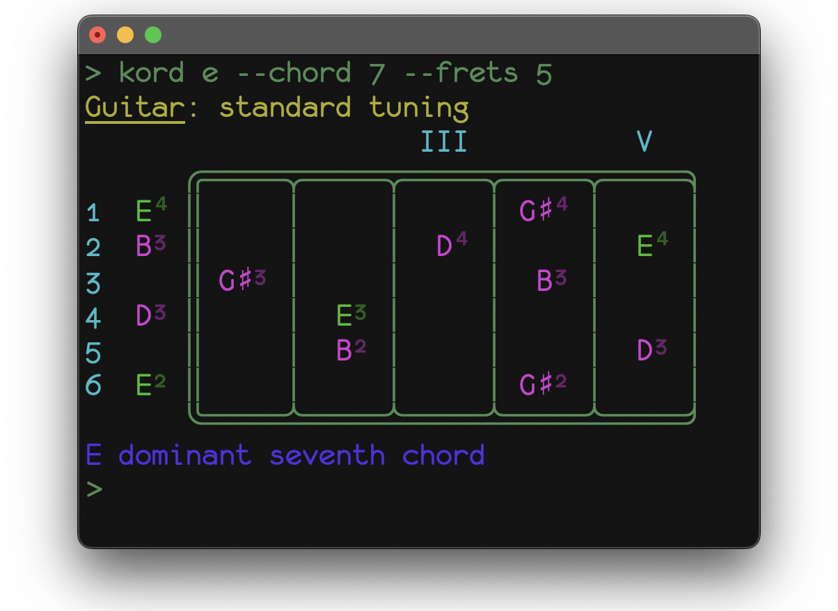 A sample application fretboard.py comes built-in with kord and gives some insight into the possibilities of the framework. It displays a representation of your instrument's fretboard, tuned to your liking along with note patterns for any given mode (scale/chord) for any given root note.