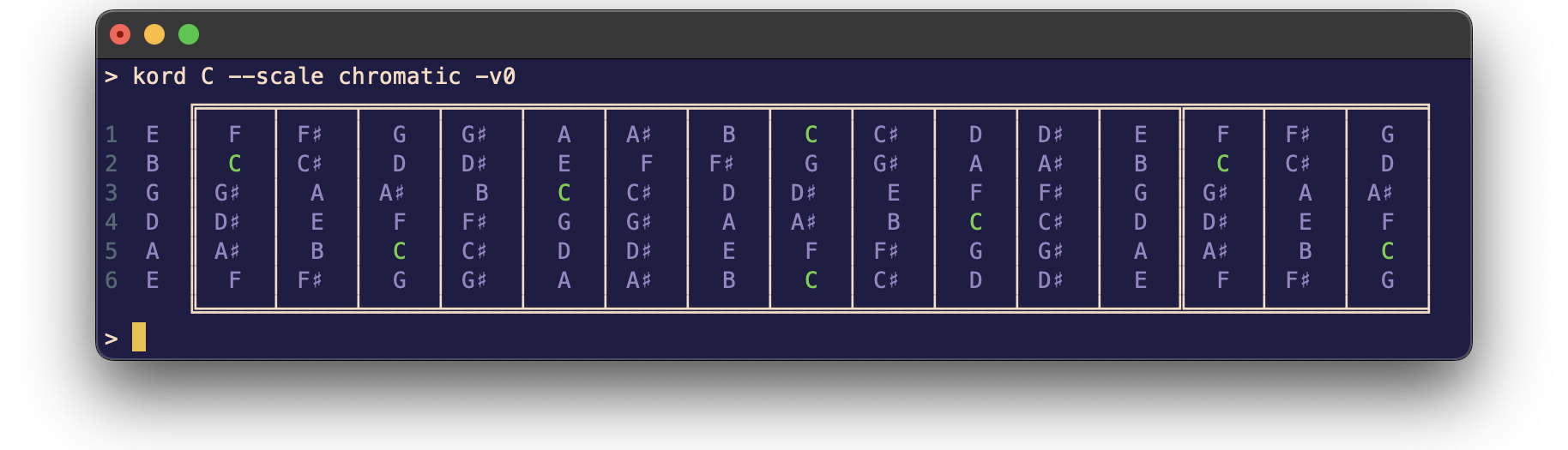 The --scale and --chord options let you choose which note pattern to display for the selected root. They are mutually exclusive and the default value is --chord maj when left blank.