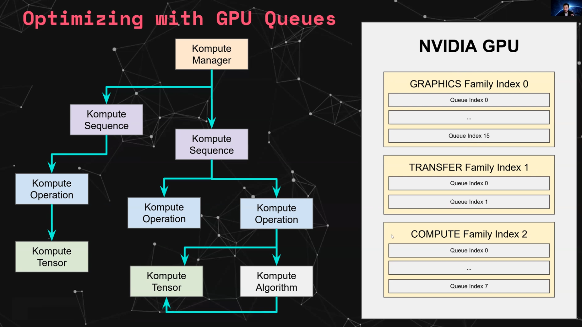 The image below provides an intuition on how Kompute Sequences can be allocated to different queues to enable parallel execution based on hardware. You can see the hands on example, as well as the detailed documentation page describing how it would work using an NVIDIA 1650 as an example.
