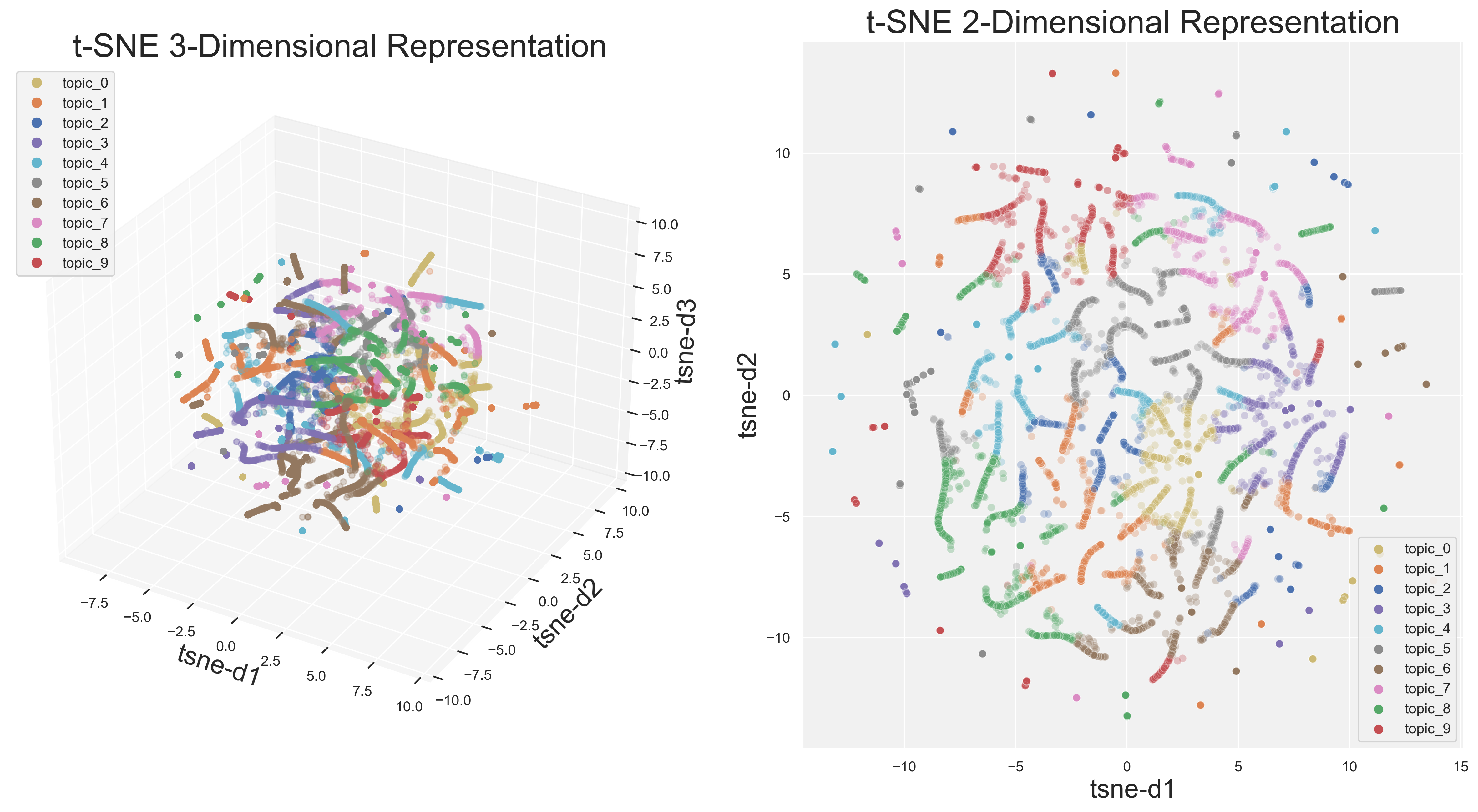 t-SNE allows the user to visualize their topic distribution in both two and three dimensions. Currently available just for LDA, this technique provides another check for model suitability.
