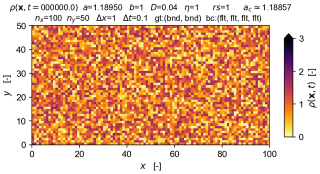 where ρ(x,t) is the order parameter field, a and b are rate constants, D is the diffusion rate over x, ξ(x,t) is Gaussian white noise (uncorrelated, zero mean, unit variance), and η is the "demographic" noise amplitude.