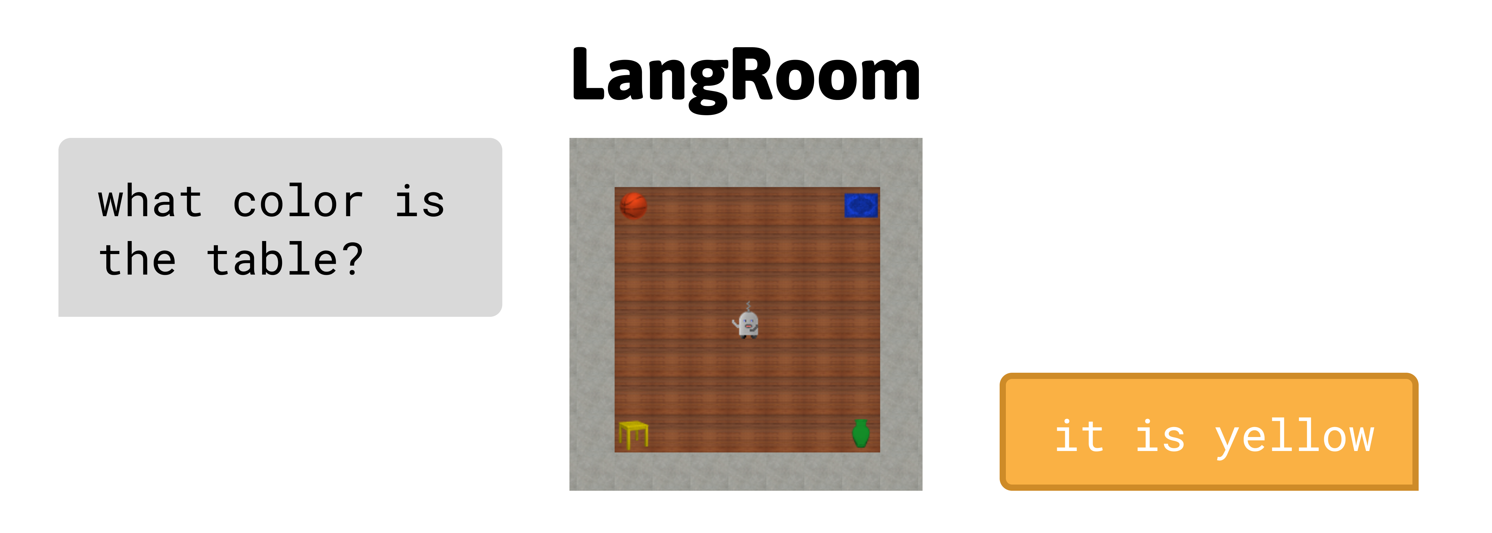 In LangRoom, agents must learn to both move and talk. LangRoom contains four objects with randomly generated colors. Agents have a partial view of the environment and receives questions "what color is ?". In response, they must seek out the correct object and generate the right answer.