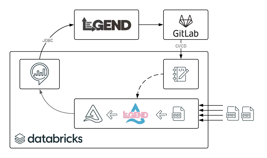 In addition to the JDBC connectivity enabled to Databricks from the legend-engine itself, this project helps organizations define data models that can be converted into efficient data pipelines, ensuring data being queried is of high quality and availability. Raw data can be ingested as stream or batch and processed in line with the business semantics defined from the Legend interface. Domain specific language defined in Legend Studio can be interpreted as a series of Spark SQL operations, helping analysts create Delta Lake tables that not only guarantees schema definition but also complies with expectations, derivations and constraints defined by business analysts.