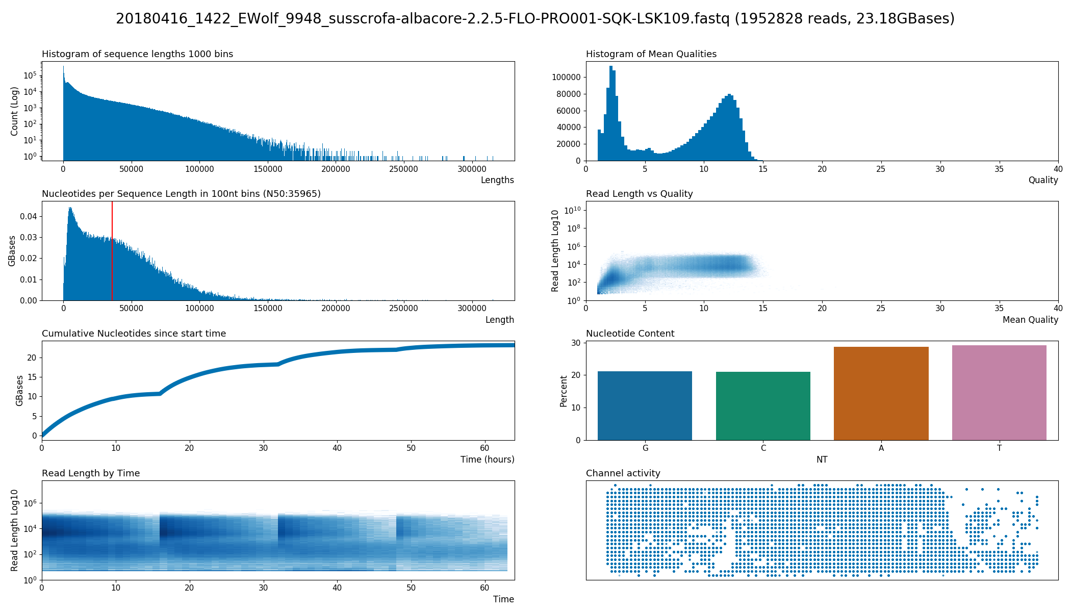 A collection of plots for long read sequencing FastQ files from devices like Oxford Nanopore's MinION and PromethION.