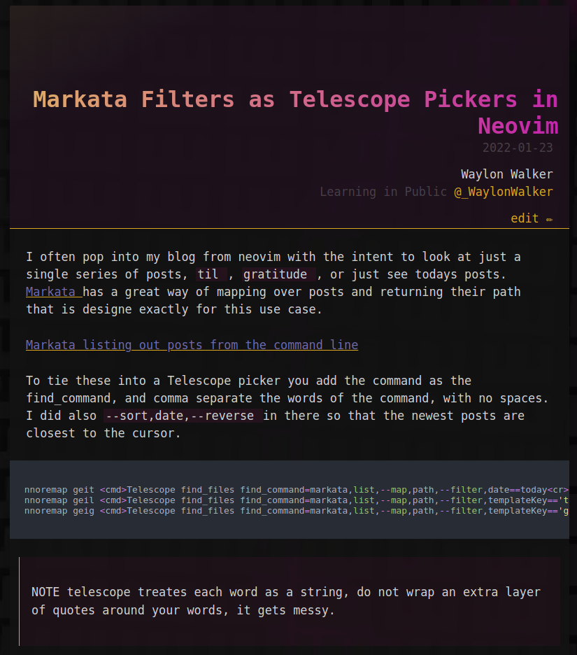 Waylonwalker.com currently has the built in cover image pluugin disabled for quick builds as it it a constantly evolving site with a lot of posts. The cover images are generated in a second repo by loading article data in from markata.json and running the covers plugin.