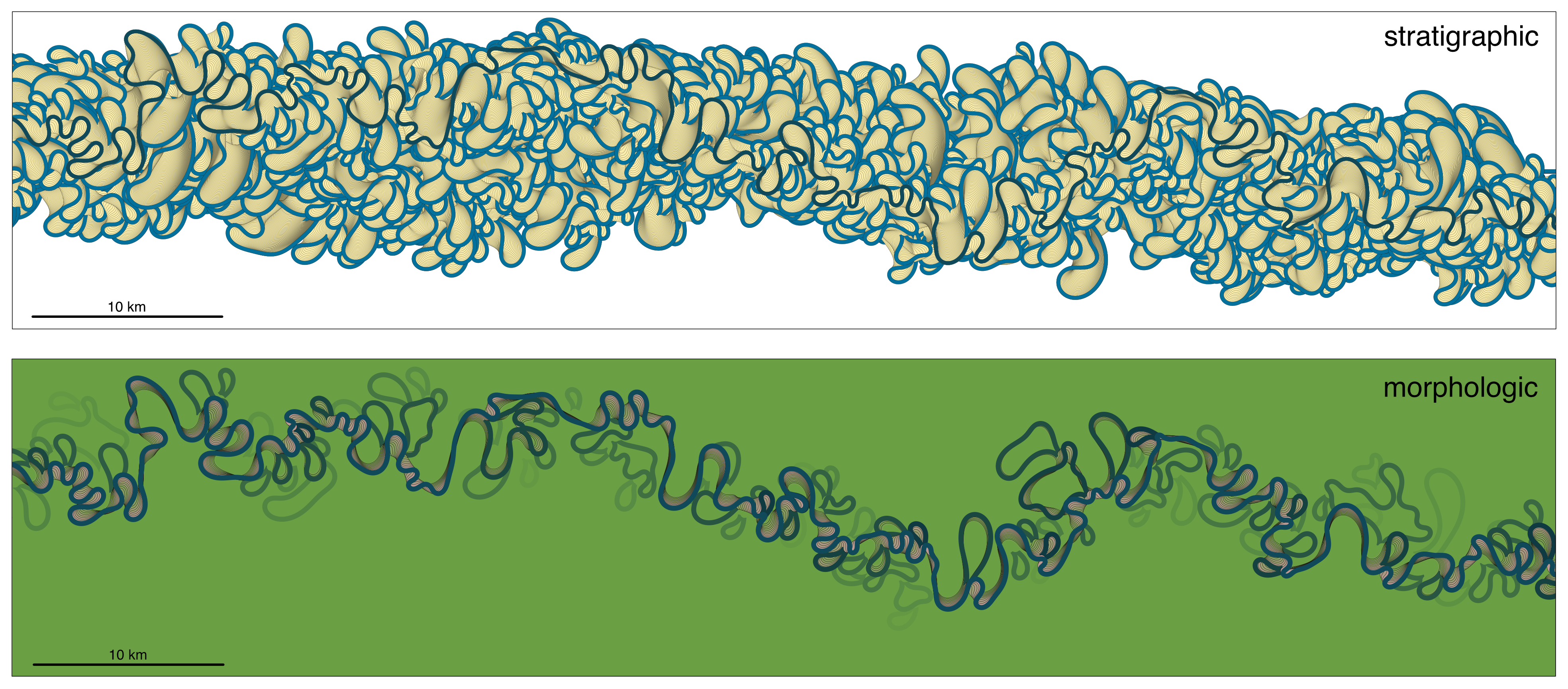 ChannelBelt objects can be visualized using the 'plot' method. This creates a map of all the channels and cutoffs in the channel belt; there are two styles of plotting: a 'stratigraphic' view and a 'morphologic' view (see below). The morphologic view tries to account for the fact that older point bars and oxbow lakes tend to be gradually covered with vegetation.