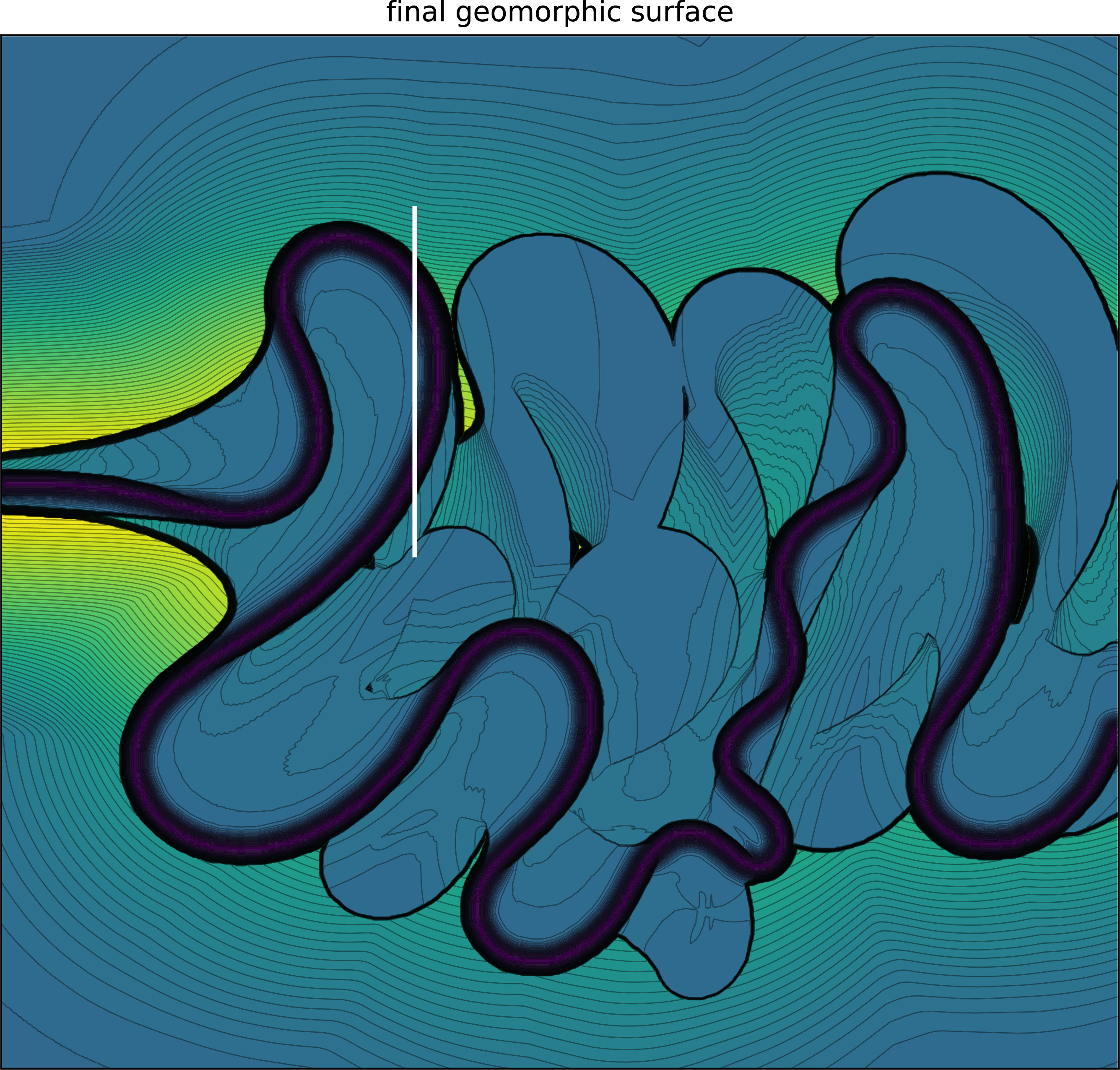 chb.migrate(nit,saved_ts,deltas,pad,crdist,depths,Cfs,kl,kv,dt,dens,t1,t2,t3,aggr_factor) # channel migration