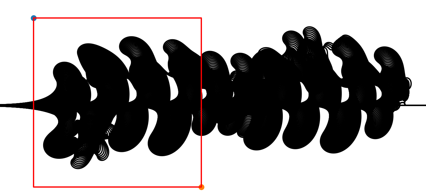 'meanderpy' includes the functionality to build 3D stratigraphic models. However, this functionality is decoupled from the centerline generation, mainly because it would be computationally expensive to generate surfaces for all centerlines, along their whole lengths. Instead, the 3D model is only created after a Channelbelt object has been generated; a model domain is defined either through specifying the xmin, xmax, ymin, ymax coordinates, or through clicking the upper left and lower right corners of the domain, using the matplotlib 'ginput' command: