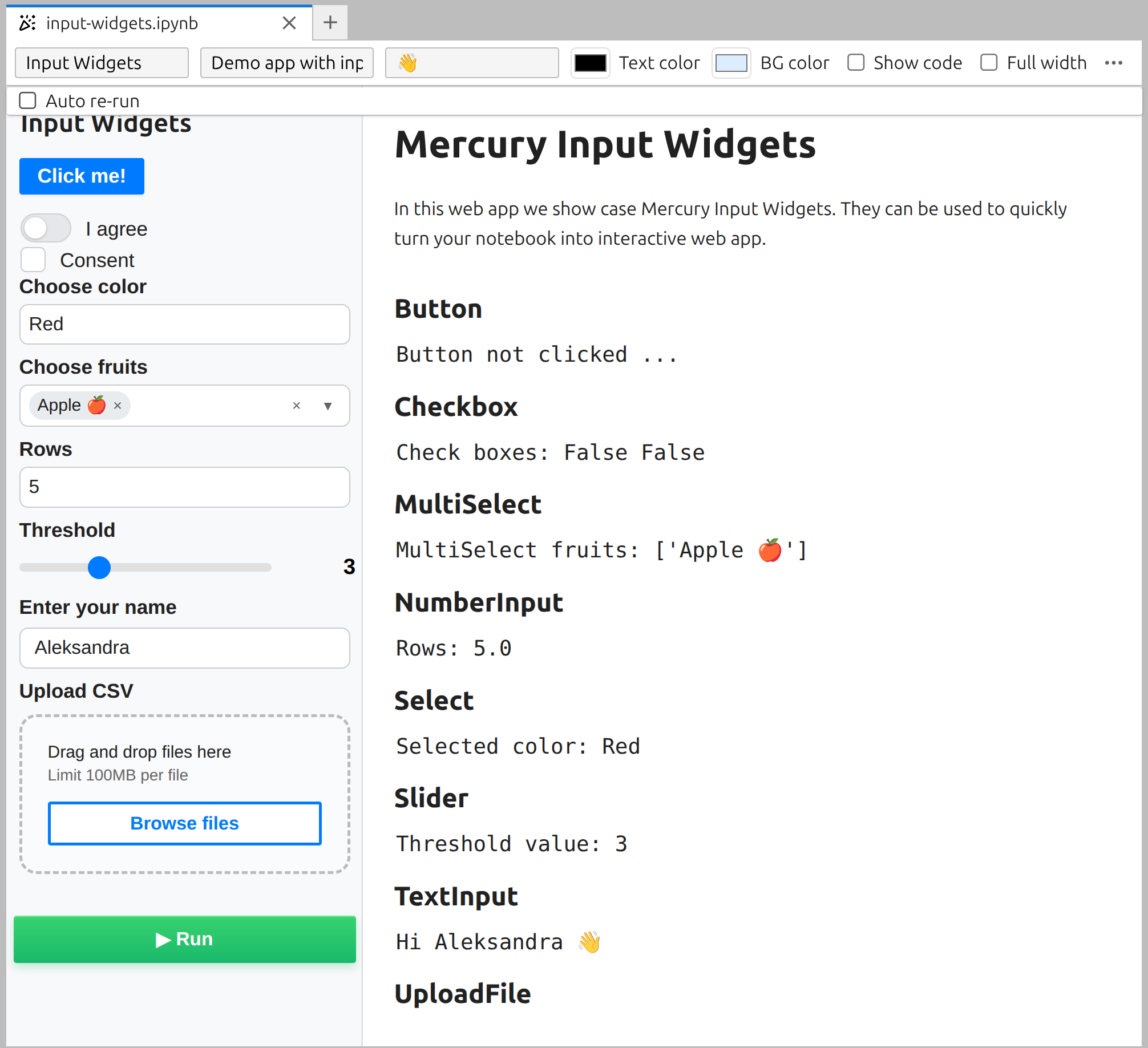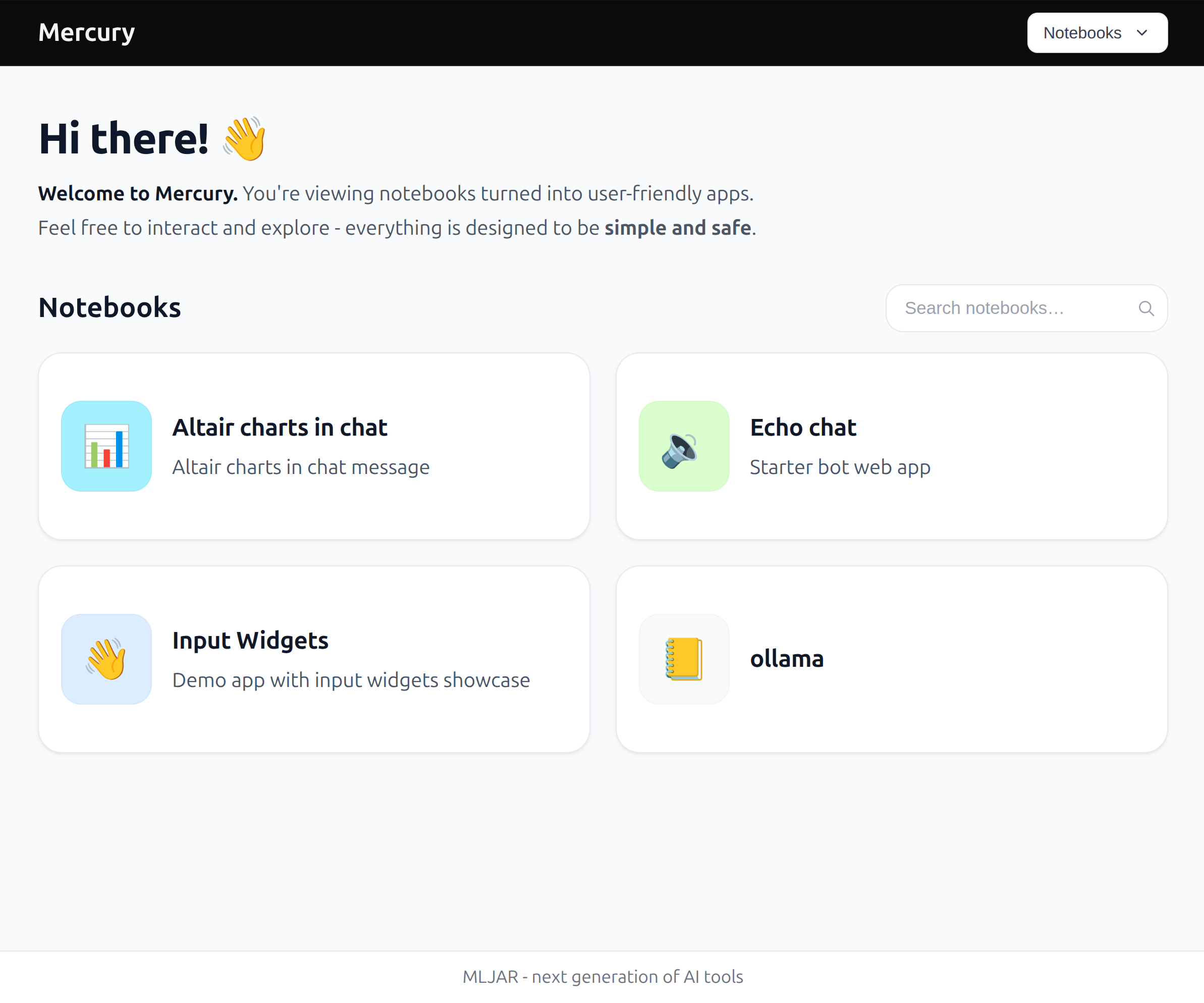 Mercury is a framework that helps you build interactive web applications directly from Python notebooks. You can build with Mercury data rich applications, like: chats, AI agents, dashboards and reports.