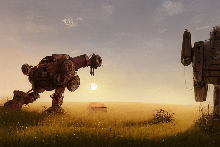 prompt=f"An old and rusty giant robot lying on a dirt road, by jakub rozalski, dark sunset lighting, elegant, highly detailed, smooth, sharp focus, artstation, stunning masterpiece"),