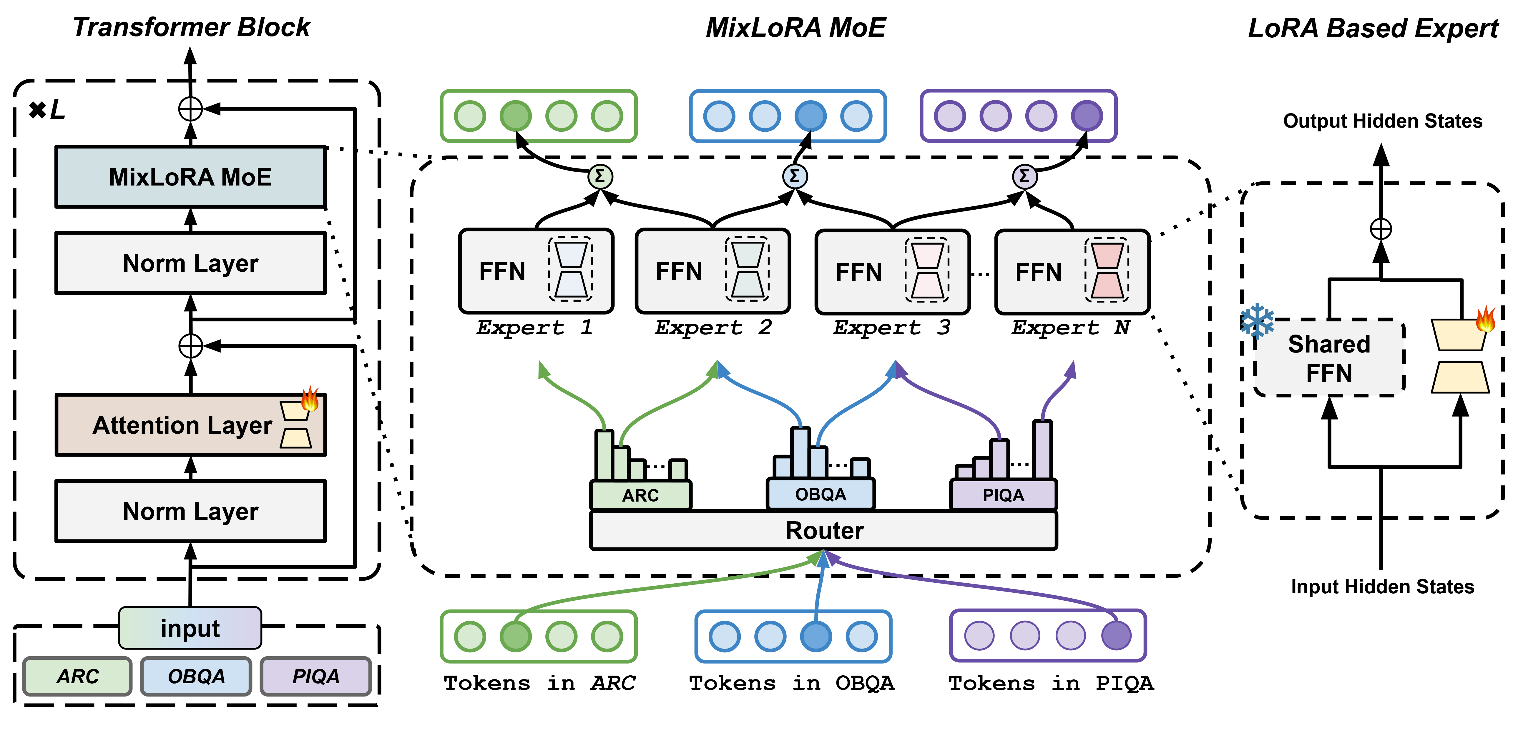 Fine-tuning Large Language Models (LLMs) is a common practice to adapt pre-trained models for specific applications. While methods like LoRA have effectively addressed GPU memory constraints during fine-tuning, their performance often falls short, especially in multi-task scenarios. In contrast, Mixture-of-Expert (MoE) models, such as Mixtral 8x7B, demonstrate remarkable performance in multi-task learning scenarios while maintaining a reduced parameter count. However, the resource requirements of these MoEs remain challenging, particularly for consumer-grade GPUs with less than 24GB memory. To tackle these challenges, we propose MixLoRA, an approach to construct a resource-efficient sparse MoE model based on LoRA. The figure above shows the architecture of the MixLoRA transformer block. MixLoRA inserts multiple LoRA-based experts within the feed-forward network block of a frozen pre-trained dense model and employs a commonly used top-k router. Unlike other LoRA-based MoE methods, MixLoRA enhances model performance by utilizing independent attention-layer LoRA adapters. Additionally, an auxiliary load balance loss is employed to address the imbalance problem of the router. Our evaluations show that MixLoRA improves about 9% accuracy compared to state-of-the-art PEFT methods in multi-task learning scenarios.