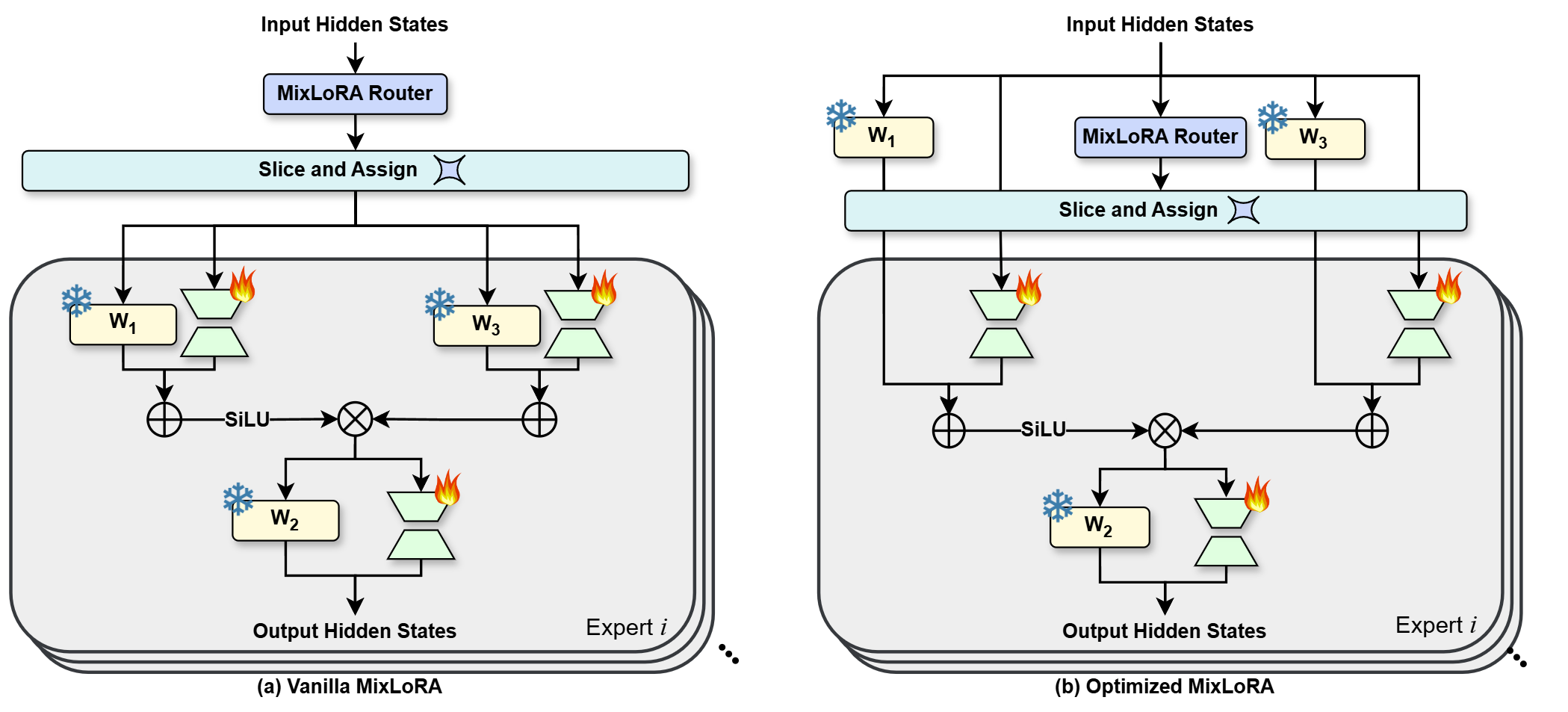 We also propose a new high-throughput framework to alleviate the computation and memory bottlenecks during the training and inference of MoE models. The figure above shows the comparison of the forward propagation processes: (a) the process in a vanilla MixLoRA MoE block; (b) the optimized process that shares computation results of $W_1$ and $W_3$ to reduce computational complexity. This framework reduces GPU memory consumption by 40% and token computation latency by 30% during both training and inference.