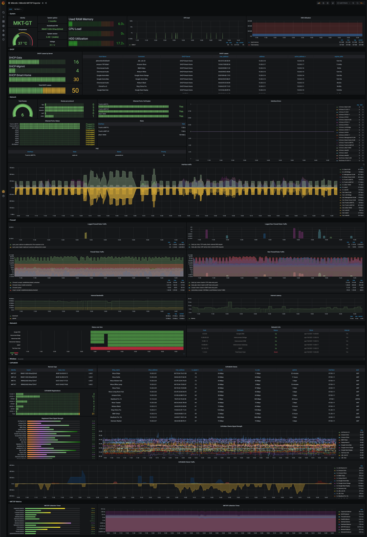Now with your RouterOS metrics being exported to Prometheus, it's easy to visualize them with this Grafana dashboard
