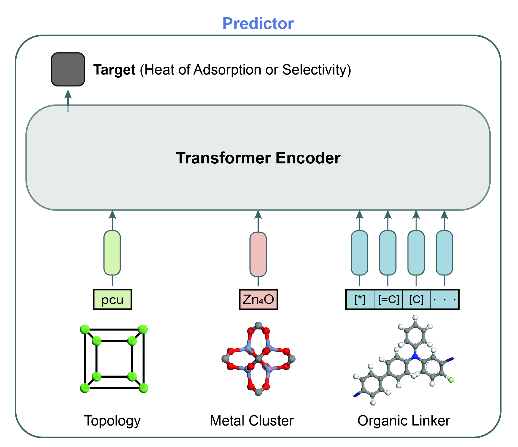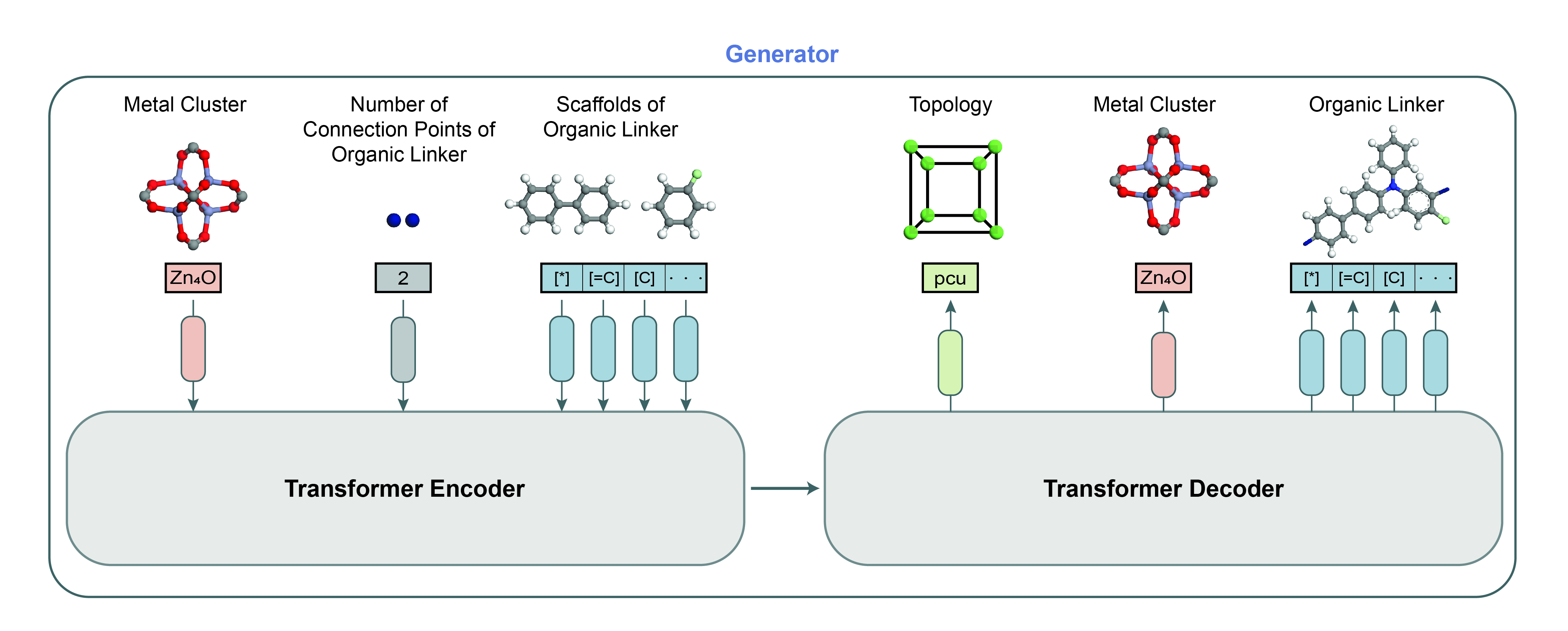 We provide a generator which selects a topology and a metal cluster, which are categorical variables, in order and then creates an organic linker represented by SELFIES string.