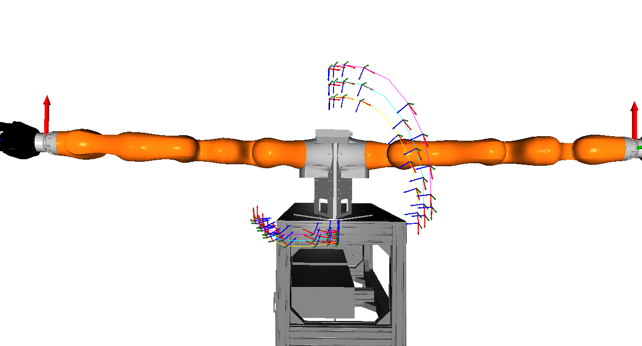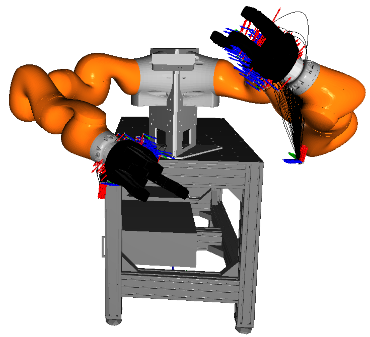 If we have a distribution over DMP parameters, we can propagate them to state space through an unscented transform. On the left we see the original demonstration of a dual-arm movement in state space (two 3D positions and two quaternions) and the distribution of several DMP weight vectors projected to the state space. On the right side we see several dual-arm trajectories sampled from the distribution in state space.