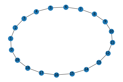 We assume there are 20 ("num_agents") agents and are connected with 2 ("num_neighbors") other agents in their neighbourhood. We assume that the positive reward and negative reward are constant values. If we assume agents are connected via ring network structure, the network looks like as in below figure. For instance, agent 0 relates to 2 agents, agent 1 and 19. Similarly, agent 5 is connected with agents 4 and 6. We assume the network to be undirected.