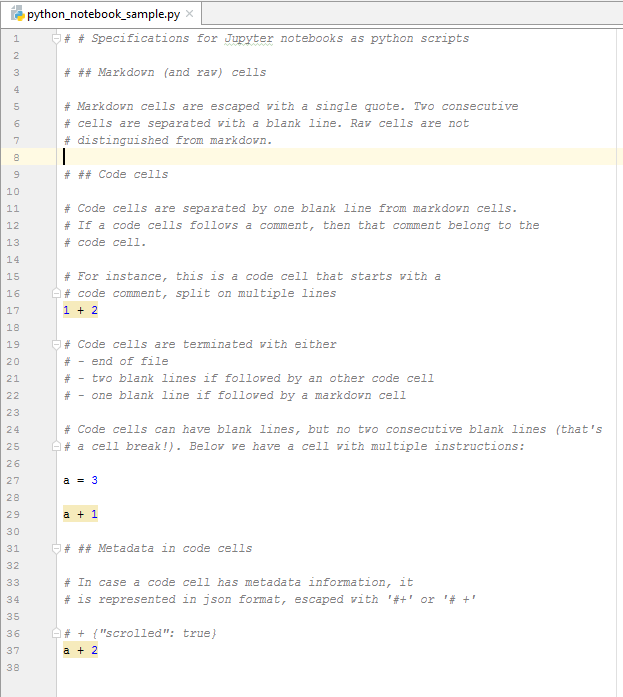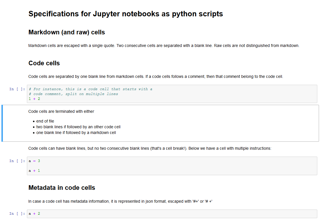- Round trip conversion, starting from a Jupyter notebook, preserves source and metadata, not outputs. In some occasions (consecutive blank lines in code cells), cells may be splitted into smaller ones.