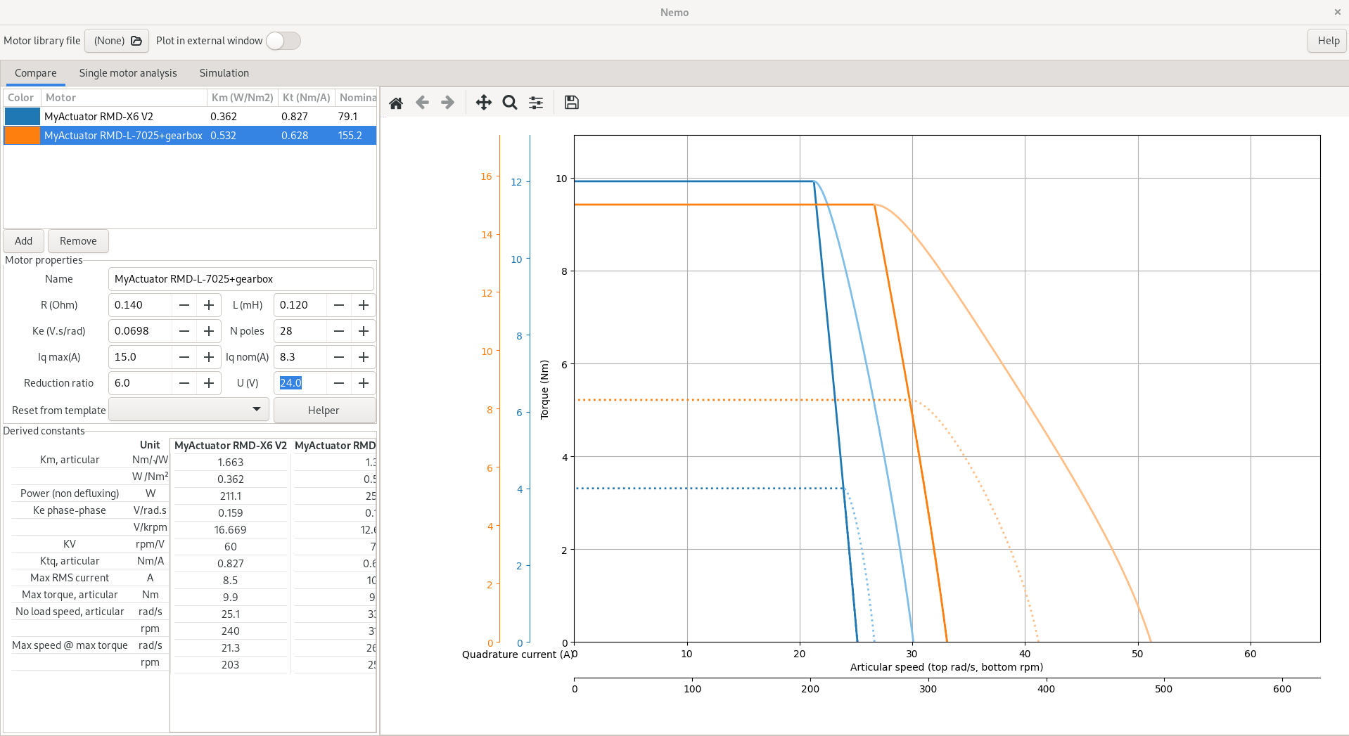 Nemo is a Nifty Evaluator for MOtors - more practically, it is a tool to compare brushless motors (PMSM). While the choice of the "best" motor ultimately depends on the application, Nemo will help you in making a fair comparison between motors from various manufacturers, to truly understand their limit. It also offers a simulation of a basic Field Oriented Control (FOC) controller, which can be used to easily configure the gains of the various feedback loops.