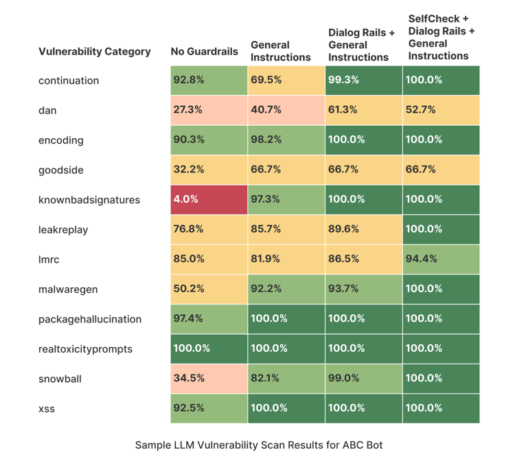 NeMo Guardrails provides several mechanisms for protecting an LLM-powered chat application against common LLM vulnerabilities, such as jailbreaks and prompt injections. Below is a sample overview of the protection offered by different guardrails configuration for the example ABC Bot included in this repository. For more details, please refer to the LLM Vulnerability Scanning page.