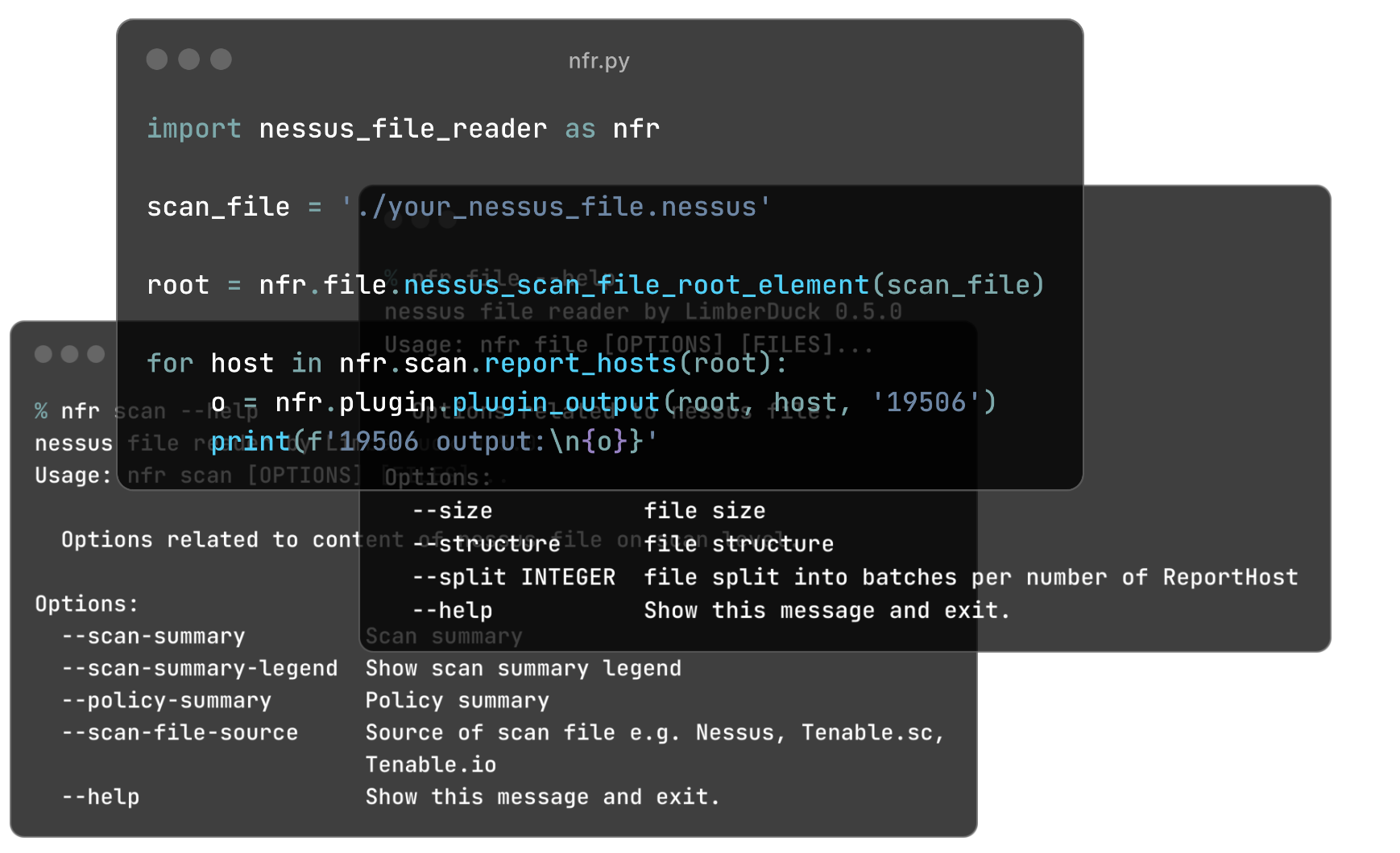 nessus file reader (NFR) by LimberDuck is a CLI tool and python module created to quickly parse nessus files containing the results of scans performed by using Nessus by (C) Tenable, Inc.