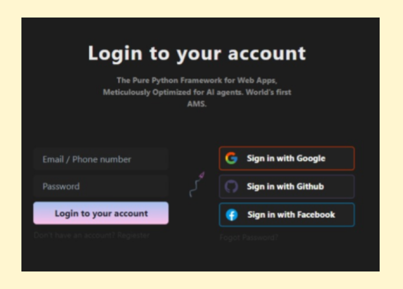 Build any web app —effortlessly and quickly ⚡. It simplifies Pythonic development for everything from backends to frontends (yes, visually 🦚stunning frontends in Python!), AI integrations, APIs, and beyond—empowering both humans and AI agents.