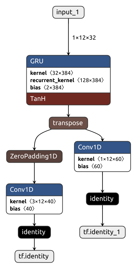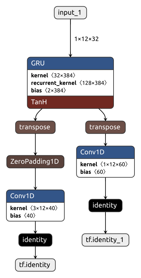 The simple lazy approach makes wonders in most situations, but sometimes it produces suboptimal graphs. Consider the code below. Imagine this is some sort of text processing network. It first applies a GRU layer which assumes the inputs do not have a channel dimension, so its input/output layouts are the same in both Pytorch and Tensorflow. But then, the outputs are passed to a couple of 1D convolutions which are channel-aware. Because of that, a transpose op must be put in the converted graph.