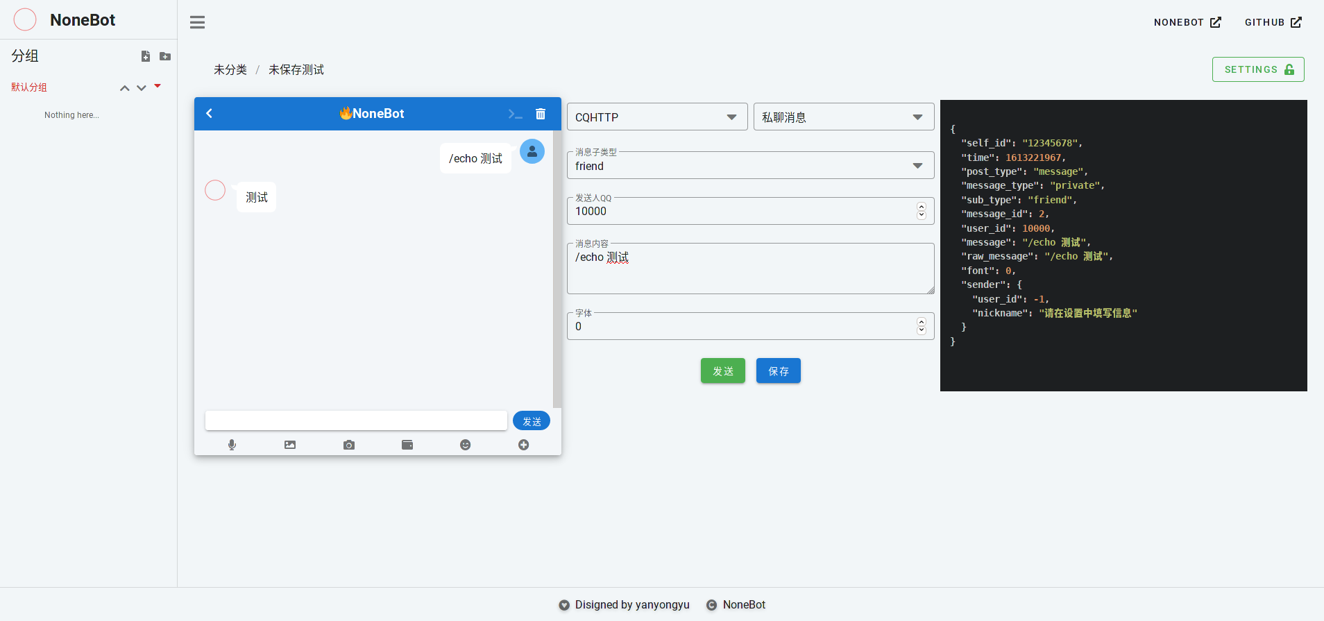 现在启动你的 bot,本地nonebot-test 包就可以开始工作了,打开 localhost:2333 (不需要打开前面所述的前端开发服务器:8080)就可以查看实时最新的前端页面了。