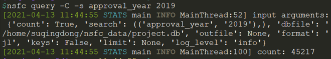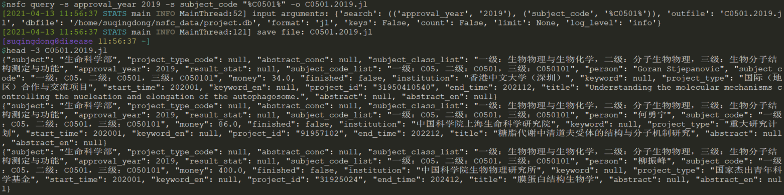 nsfc query -s approval_year 2019 -s subject_code "%C0501%" -o C0501.2019.jl