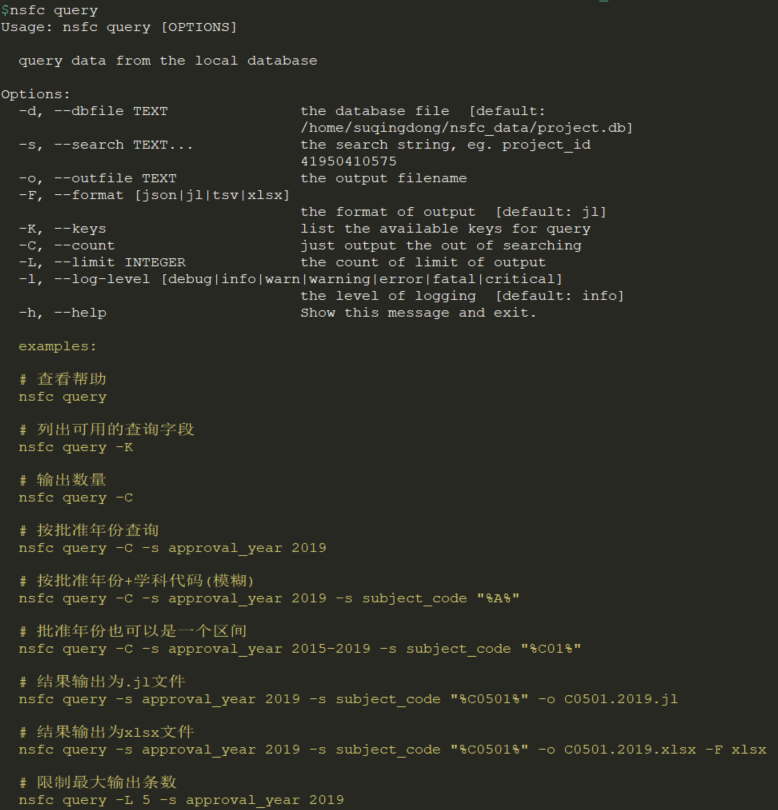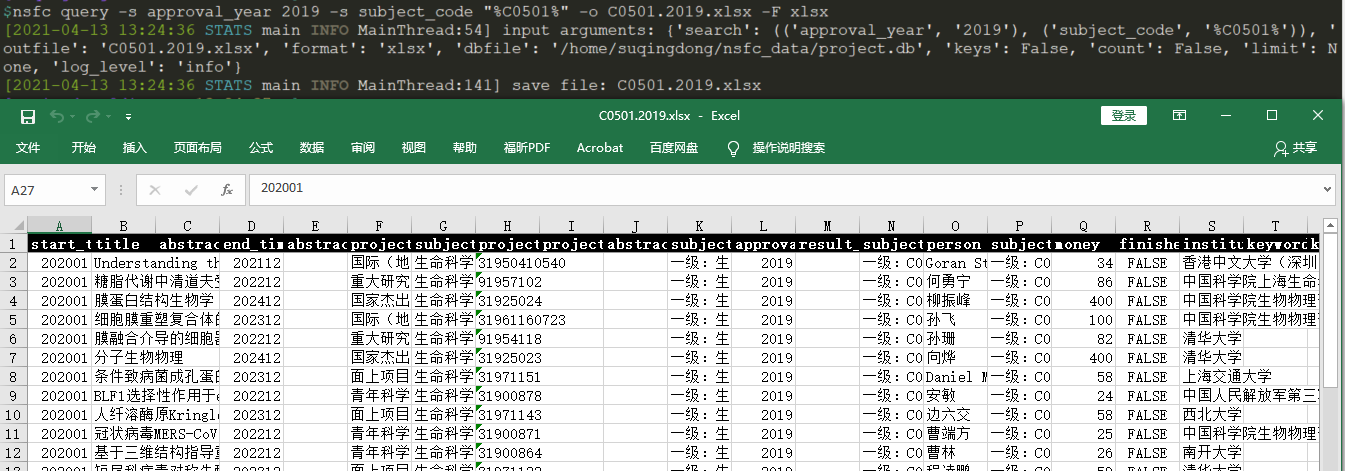nsfc query -s approval_year 2019 -s subject_code "%C0501%" -o C0501.2019.xlsx -F xlsx