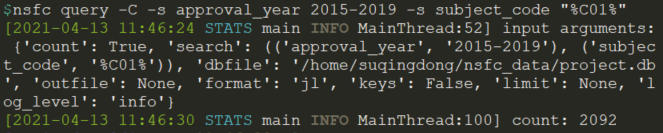 nsfc query -C -s approval_year 2015-2019 -s subject_code "%C01%"