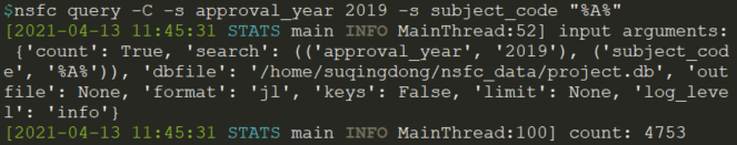 nsfc query -C -s approval_year 2019 -s subject_code "%A%"
