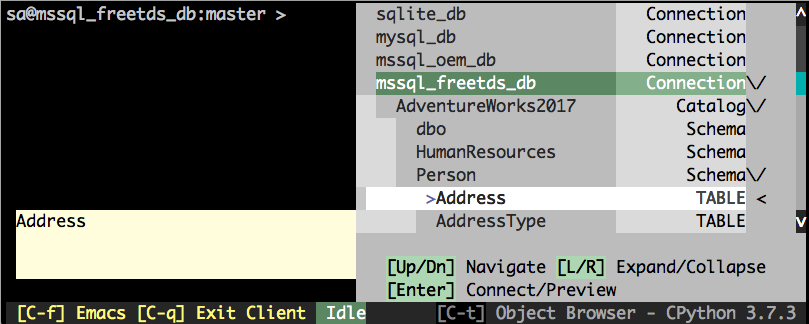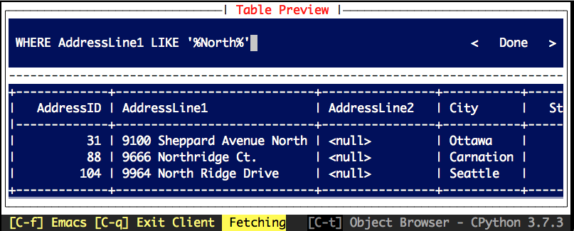 As is the case with the remaining clients derived from the python prompt toolkit library, odbc-cli also supports a rich interactive command line experience, with features such as auto-completion, syntax-highlighting, multi-line queries, and query-history.